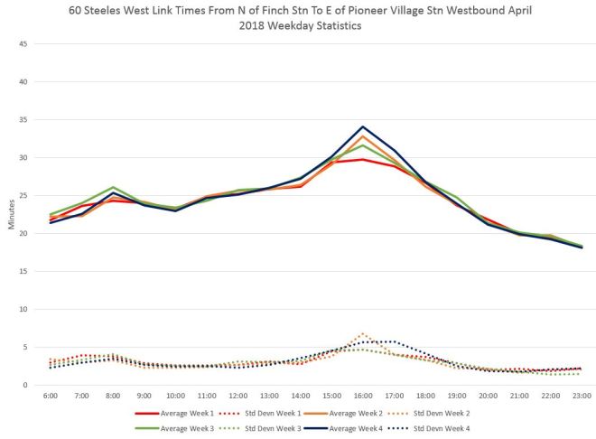The first section of the chart below shows the time taken at Pioneer Village Station by buses that are continuing through to the west. The segments from Jane to Weston Road, and from Weston Road to Islington also show the effect of PM peak congestion.