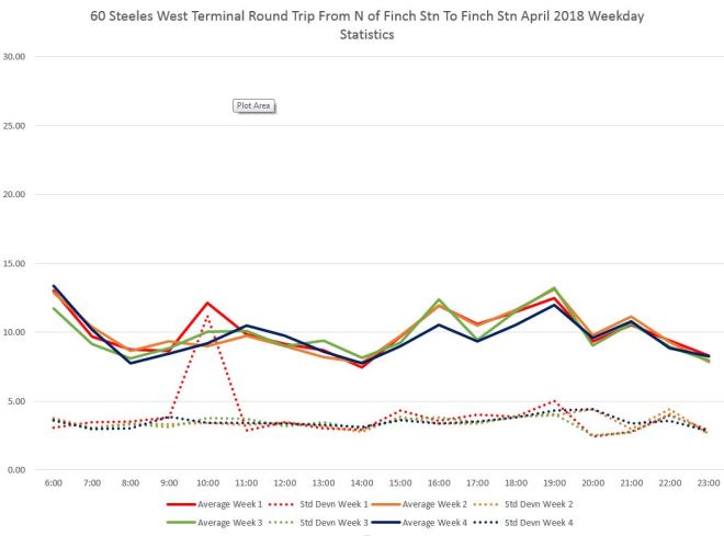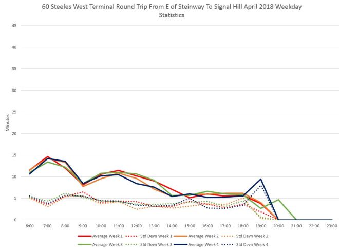 For the route as a whole, the trip times between the outer terminals hit averages around 70 minutes each way with a standard deviation of 5-10 minutes indicating that there is considerable range of these values. Adding in about 10 minute at Finch Station and at least 5 at the Steinway/Highway 27 loop gives a total of 155 minutes. The scheduled round trip time was only 143 minutes in April 2018, and it is no wonder that the service is not reliable. (By fall 2018, this had been increased, but only to 147 minutes.)