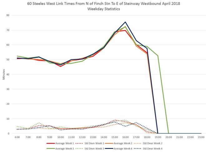 Here are the charts for westbound travel from Finch Station in April 2018. The first page shows the route between Finch and Pioneer Village Stations. It is no surprise that the biggest peak period effect falls in the afternoon for westbound travel.