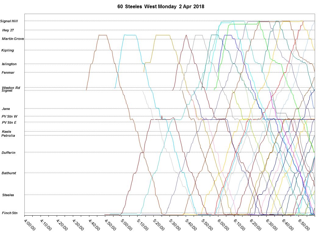 Through the midday, note the bunching of service east of Pioneer Village Station and the uneven service west to Signal Hill. The length of layovers at the west end of the line show that scheduled travel time was not an issue and the unevenness of departures was a matter of driver choice and a TTC standard that allows a six-minute wide margin for “on time” service.