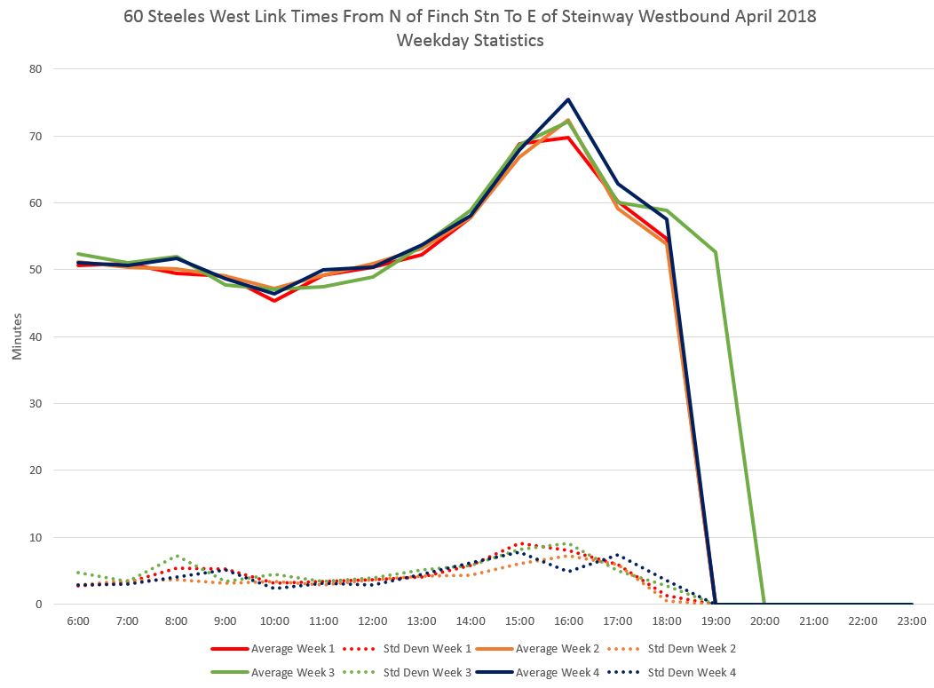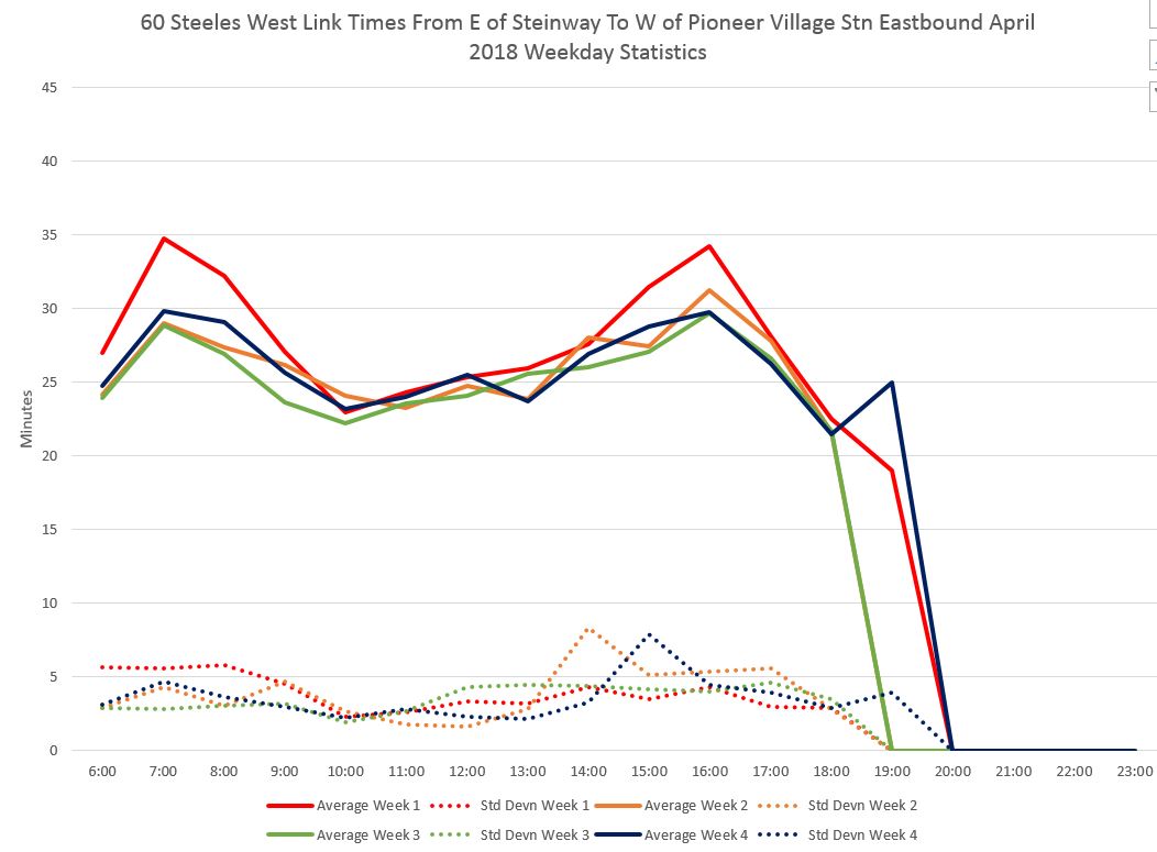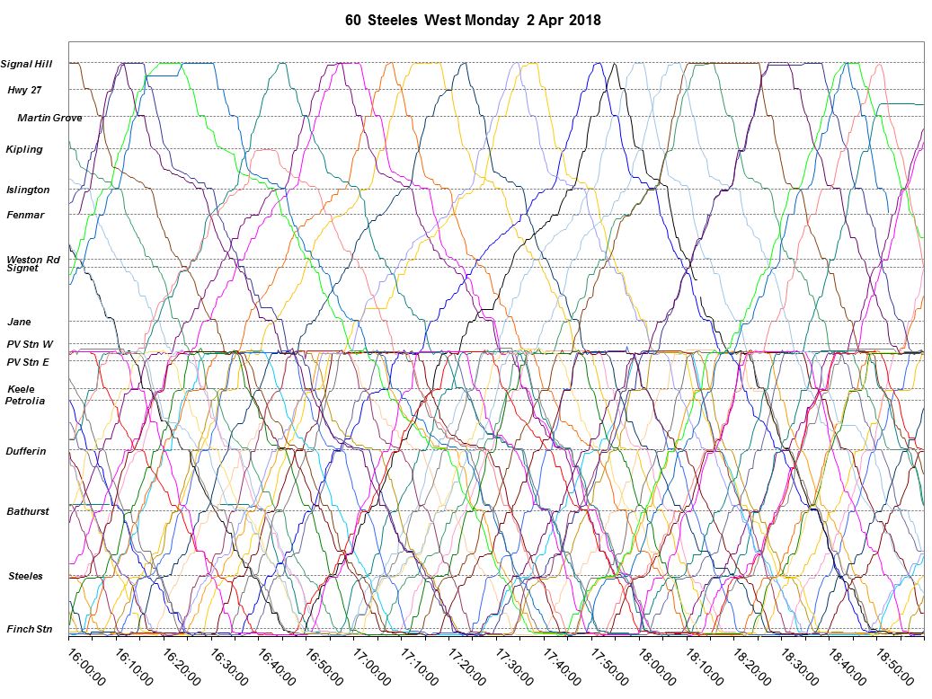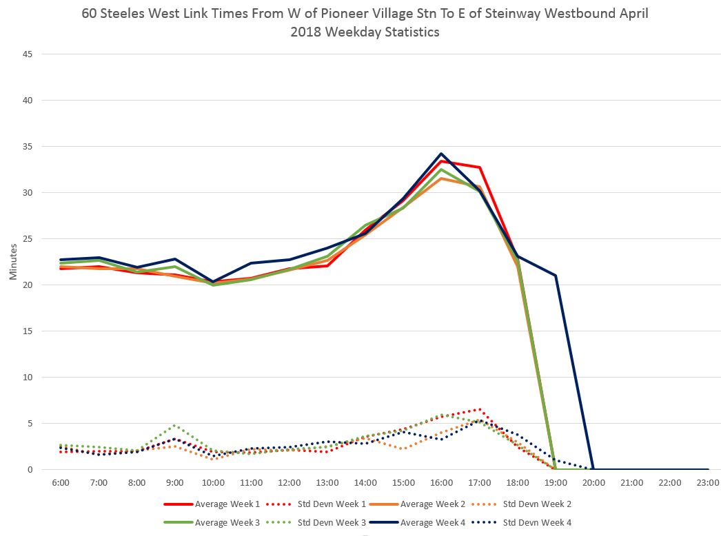 The first section of the chart below shows the time taken at Pioneer Village Station by buses that are continuing through to the west. The segments from Jane to Weston Road, and from Weston Road to Islington also show the effect of PM peak congestion.