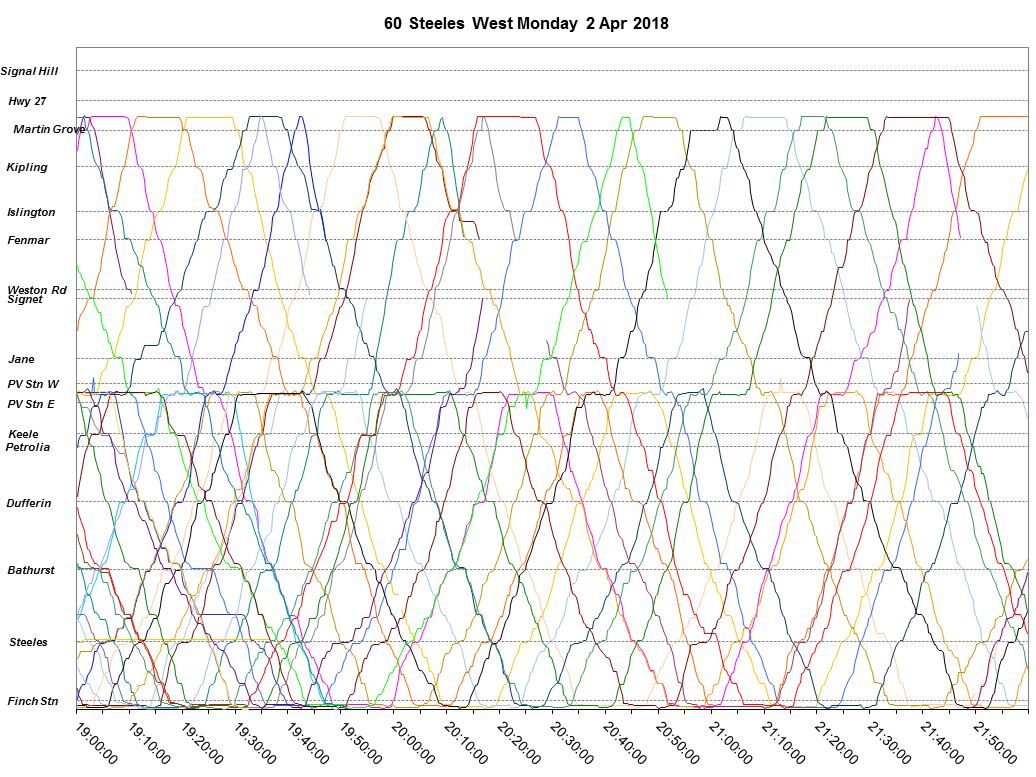 Service through the evening has few congestion effects, but headways continues to be uneven. In particular note that the blending between through service to Martin Grove and the shorter Pioneer Village branch is poor leaving both Finch and Pioneer Village Stations, both points where service could be regulated for even spacing.