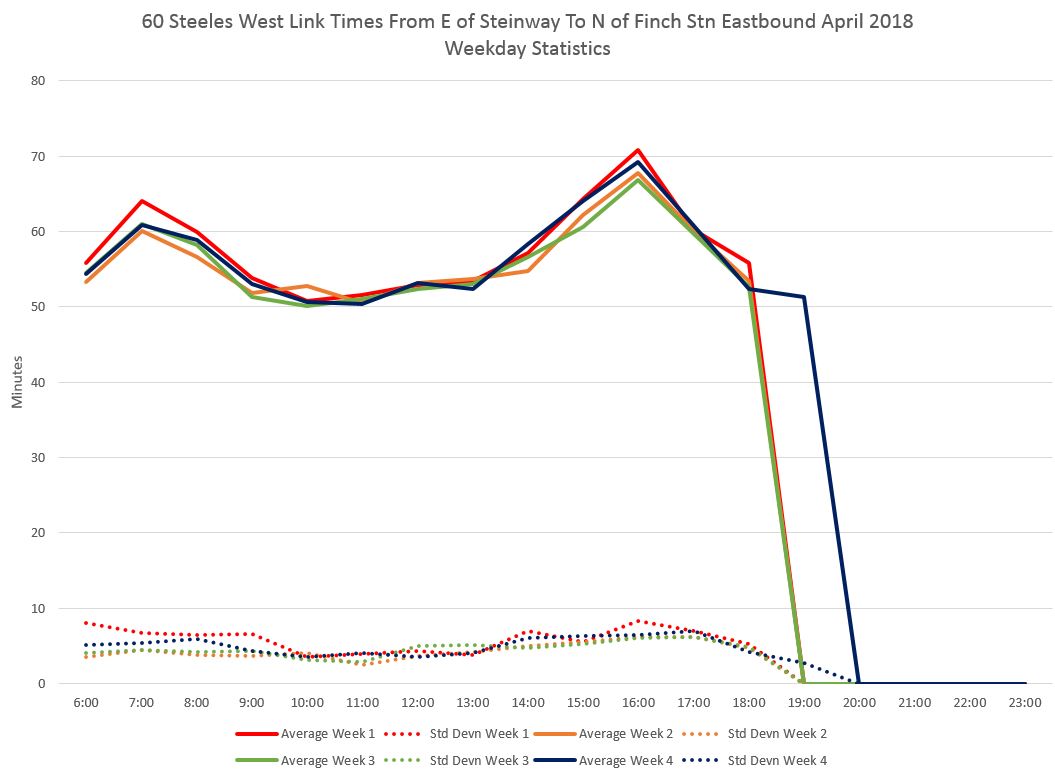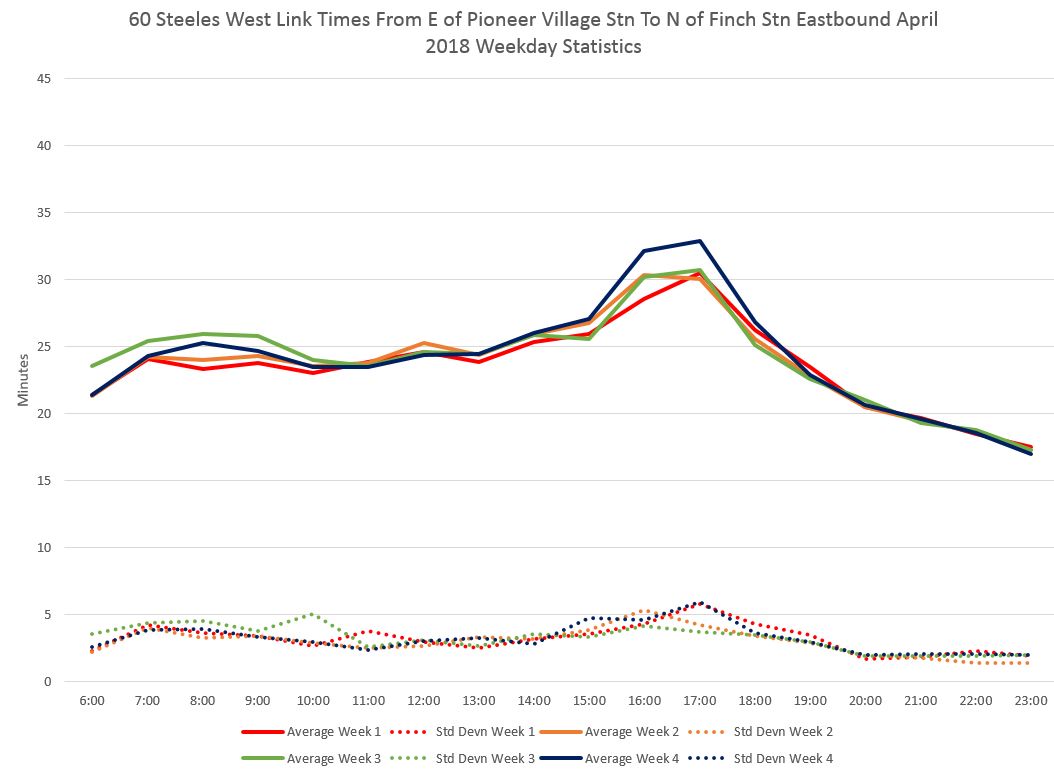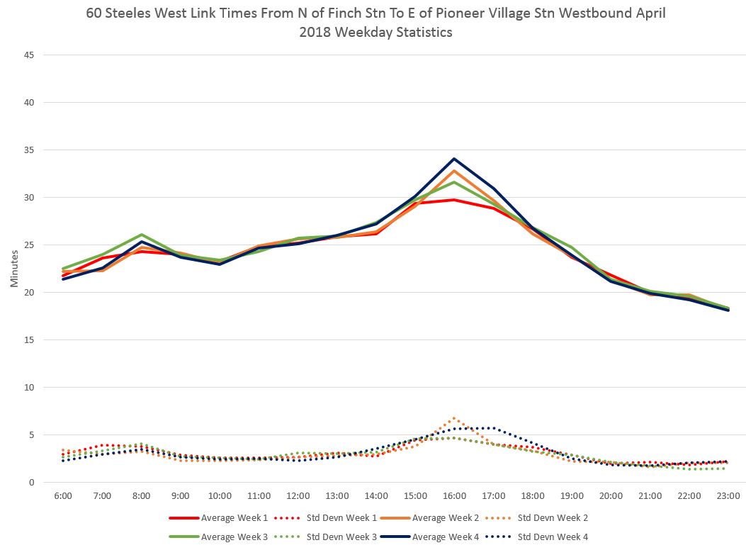 Here are charts showing the average travel times between Finch and Pioneer Village Stations measured from just north of Finch to just east of Pioneer Village. (This omits time actually spent in the stations which can vary considerably.) During the PM peak, the standard deviation can be over five minutes indicating a fairly wide range of travel times.