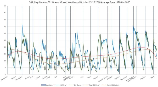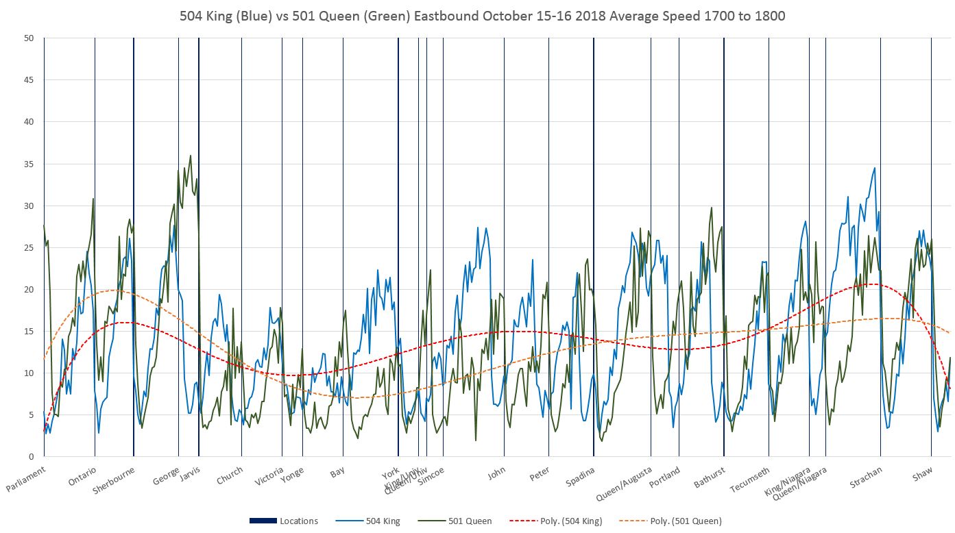 The values show in these charts are derived from TTC vehicle tracking data. This originates in GPS format, and after cleaning up the “rogue” points that are off route due to GPS errors, what is left is mapped onto a version of the route broken into 10m segments. The speed of a vehicle at each segment is determined by the “before” and “after” locations of adjacent GPS observations and the time difference (usually 20 seconds) between them.