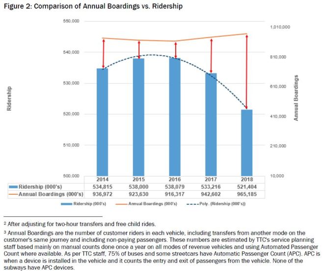 An important distinction between “ridership” and “boardings” has come up recently in TTC reports, and this is echoed by the AG’s report. When the TTC cites a “ridership” figure, this is actually a value calculated from revenue, not a direct count of passengers. On the other hand, counts by Service Planning are based on a sample of real observations in the field and data from automatic passenger counters on surface vehicles, where they exist (primarily on buses).