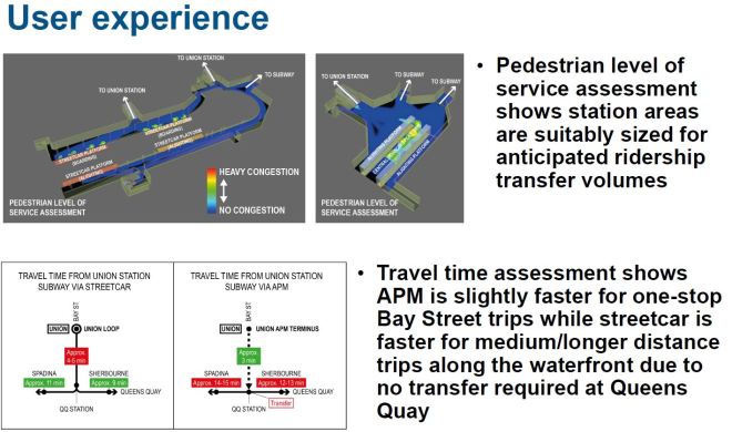 Travel times to Queens Quay would change for short trips with the APM option because there would be more frequent departures from Union than with the streetcar service. However, for trips bound anywhere beyond Bay & Queens Quay, the addition of a transfer would lengthen journeys.