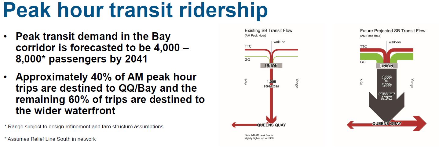 When the developments build out, there will be very strong demand from Union to Queens Quay in the peak period, especially from GO Transit with the greater flow headed east to new employment and educational sites.