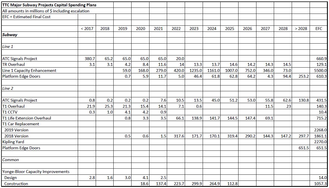 Updated March 20, 2019 at 6:40 am: The spreadsheet of major project costs has been revised to show the correct final cost for the Line 2 Platform Edge Doors project. The value under “post 2028” was correct, but the EFC originally contained the value for the Bloor-Yonge project. This change does not affect the text of the article as PEDs were cited only in that table.