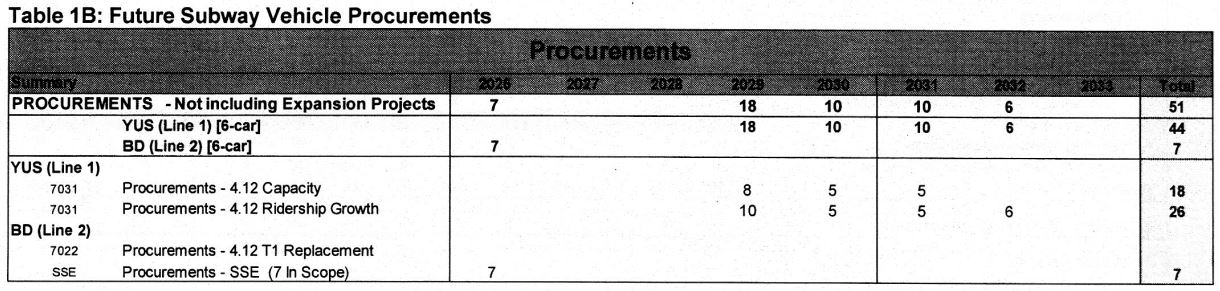 This chart shows the planned acquisition of two sets of trains. Seven would be bought in the mid-2020s for the Line 2 Extension (SSE), and 44 would be bought for Line 1 YUS from 2029-2033.