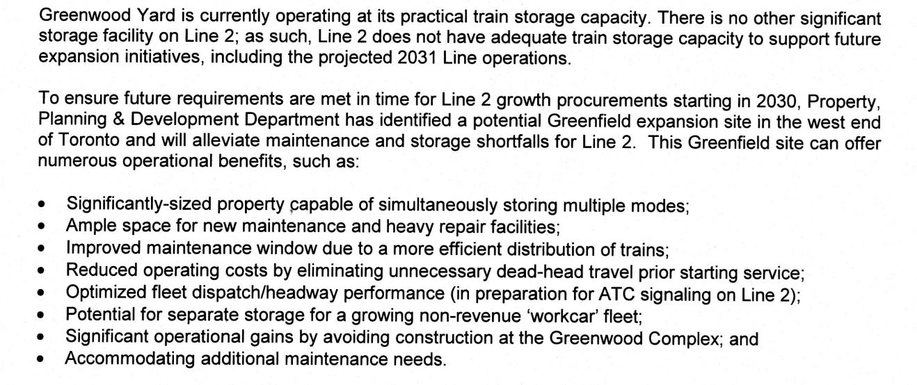 Although it is not mentioned in the Capital Budget or Plan, the Relief Line design assumes that its trains will be serviced from Greenwood Yard. This would have been possible because Line 2 would have a new fleet served from Kipling Yard.