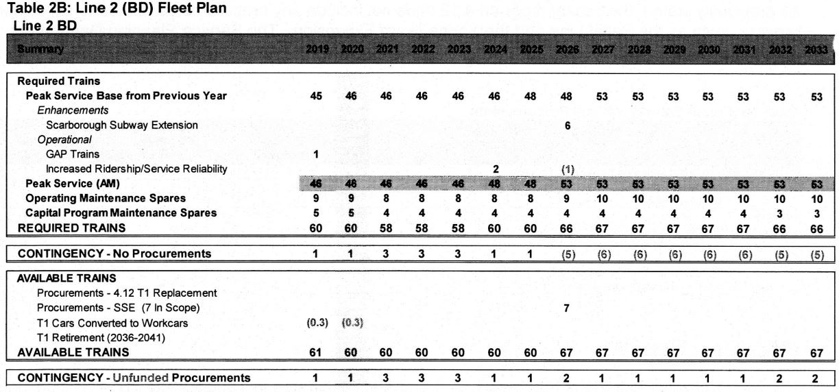 The overall need for more subway cars is summarized in the following introductory text to the fleet plan. However, the text claims that procurement of cars for extensions (Scarborough and Richmond Hill) are in a separate program when, in fact, the numbers are included in the fleet plans for Lines 1 and 2.