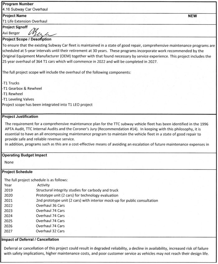 The TTC does not actually know whether the overhaul is technically feasible and will achieve the hoped-for lifespan. The experience with the shortfall in the streetcar life extension is fresh for everyone, and there is no guarantee that the T1 overhaul will achieve its aims.
