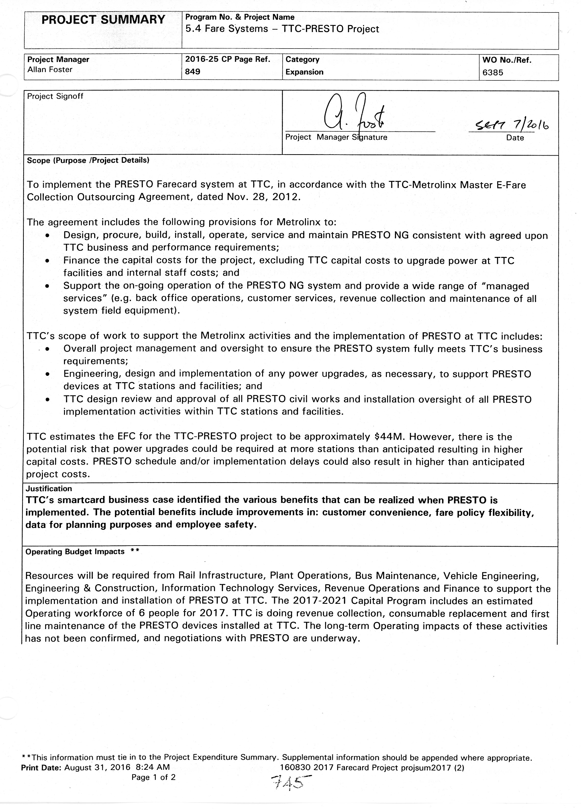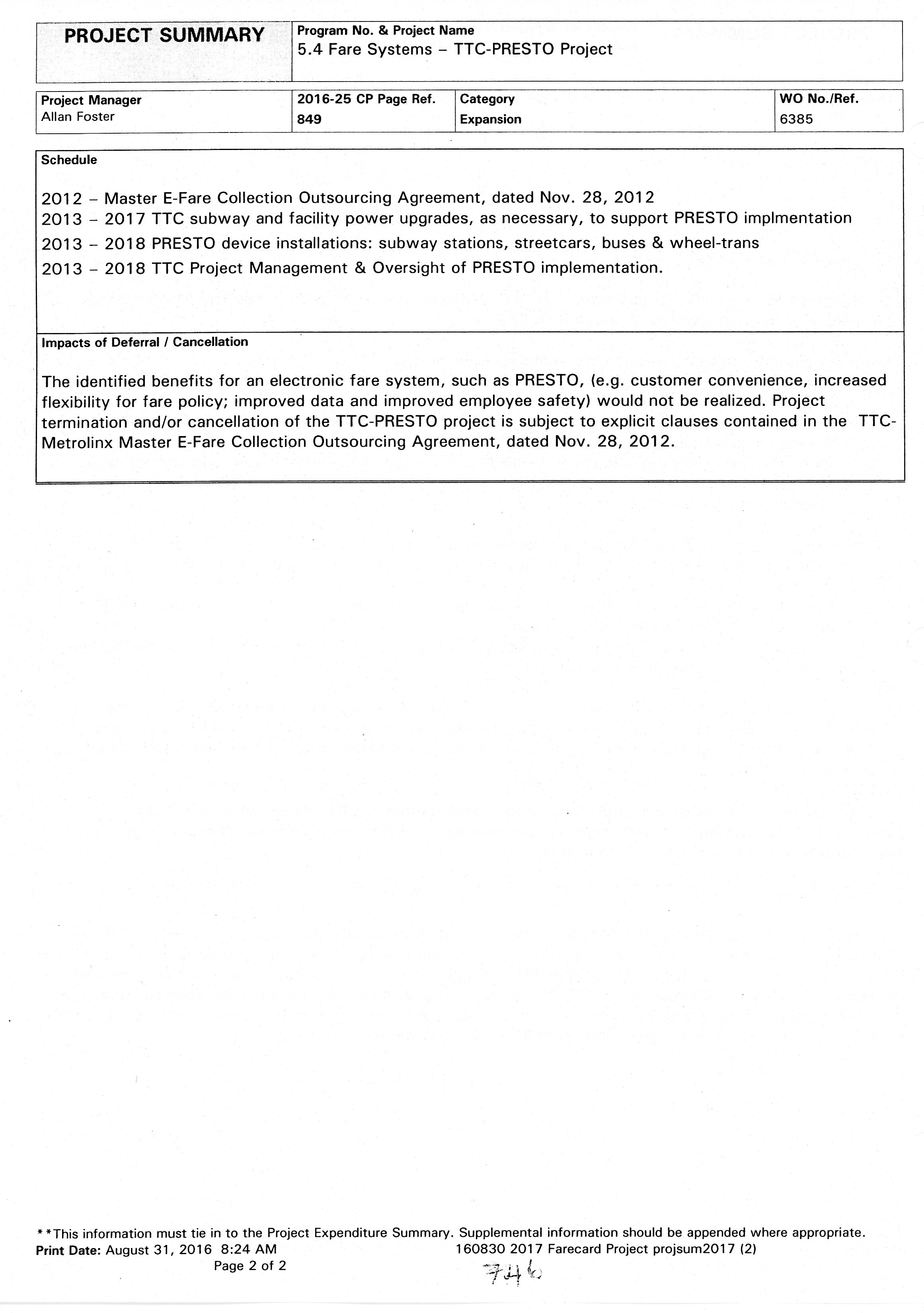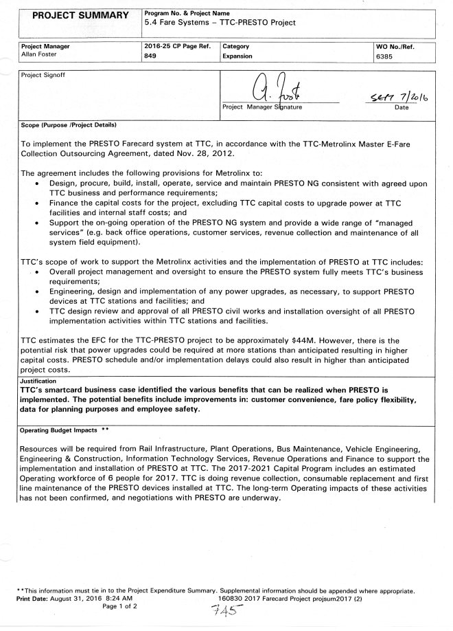 The PRESTO rollout was anticipated to be substantial complete in 2018 with the rollout of the PRESTO Ticket product, and solutions for cross boundary travel, downtown express travel and other PRESTO payment products. MX was unable to deliver these items, particularly PRESTO Tickets, as expected in 2018 and delayed the implementation to 2019. Resources were also added to the capital program to addresses software quality and system performance issues. Additional capital funds were requested to accommodate and support the continued work and change to the PRESTO implementation plan.