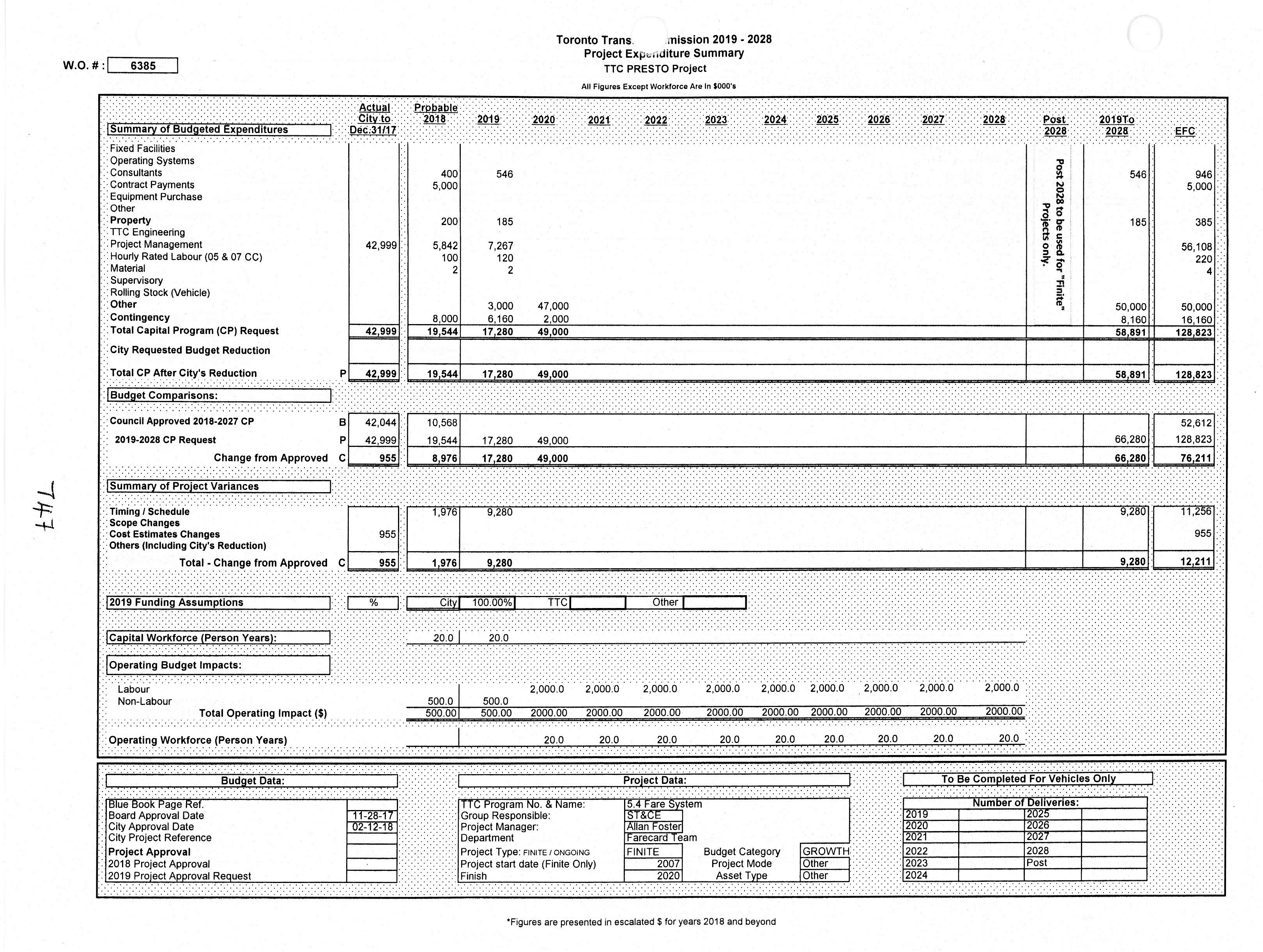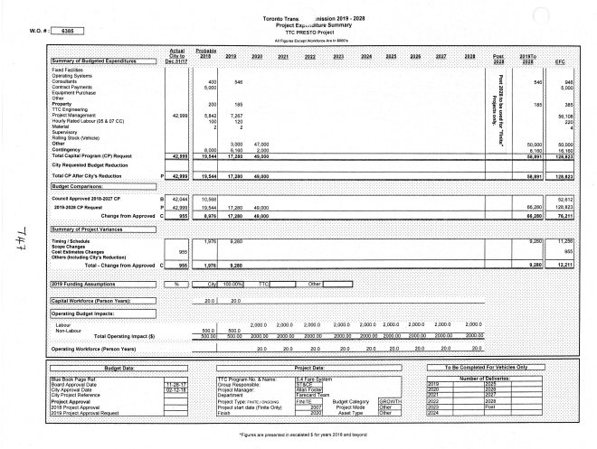 On March 5, 2019, I asked the TTC what this proposed spending was to cover considering that the Project Summary (below) is silent on this new money.