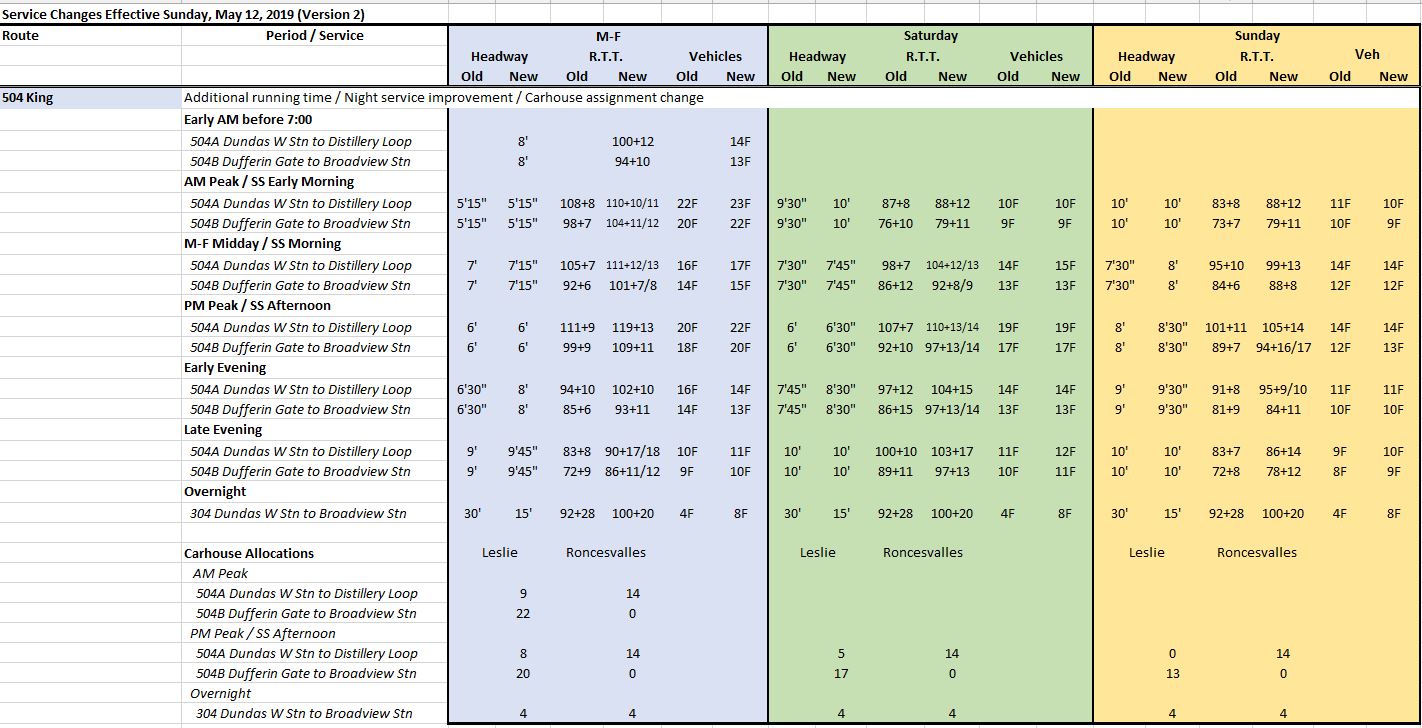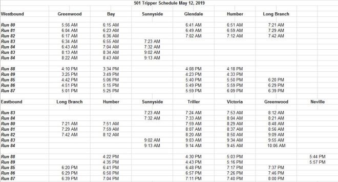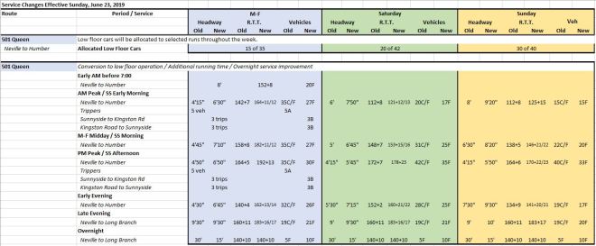 Overcrowding on the 501 Queen car is a concern given plans to replace the existing service with all low-floor equipment on June 23. The actual increase in scheduled capacity will be small because although larger cars will serve all trips, they will come much less often (9.2 cars/hour on the new schedule vs 14.1 cars/hour on the existing one). Many 501 Queen trips are already served by the larger low-floor cars, and the new schedule actually represents a decrease in capacity when this is taken into account.