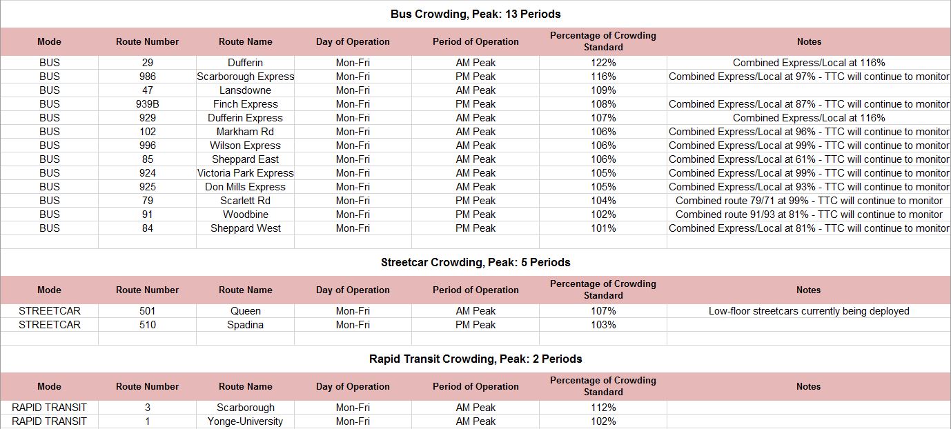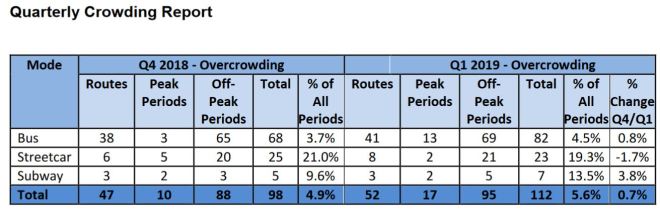 The May 2019 TTC CEO’s Report included a small table summarizing crowding statistics on the transit system.