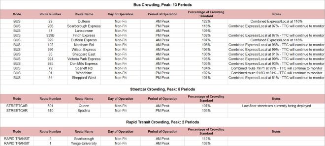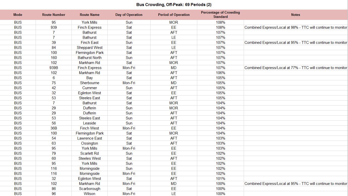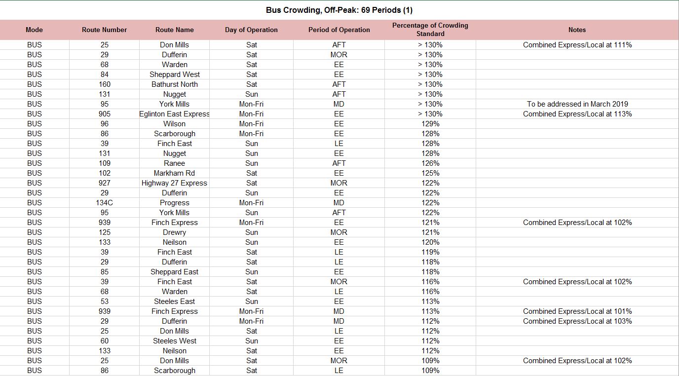The problem with summaries is that crucial details can be left out, and the actual situation riders face can vanish within averages that combine what is good in the system with what is not. Riders ride real routes at specific times, and good performance on other routes and other times don’t do them much good when they cannot get on a vehicle. From a political point of view, it is useful to know where the problems are because the more parsimonious members of Council and the TTC Board often regard transit service as excessive and wasteful.
