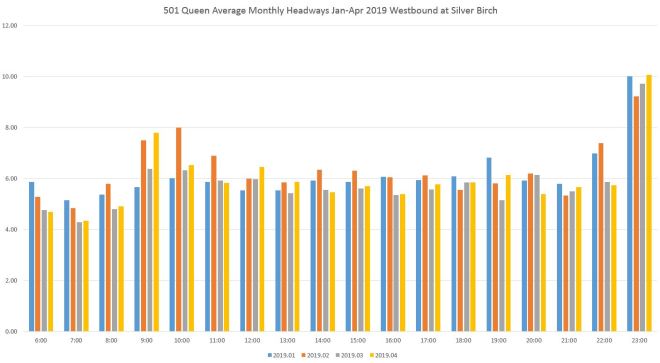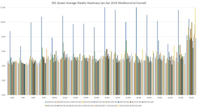 Note that the same scheduled headway operated on Queen for the entire four month period. Only weekdays are included here. Although there are transitional periods where the scheduled service is not the same throughout an hour, there should still be the same level of service over that hour every day. The averages shown below will reflect what actually happened.