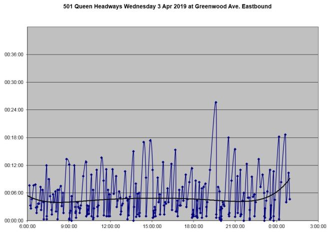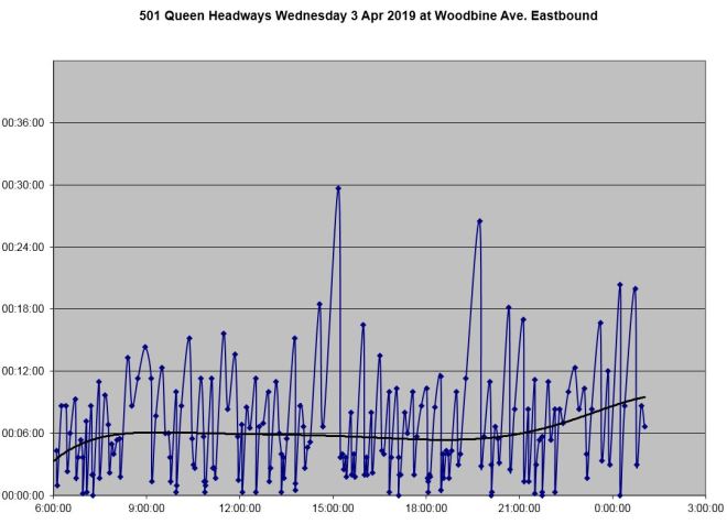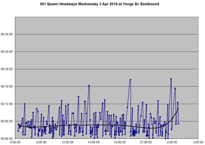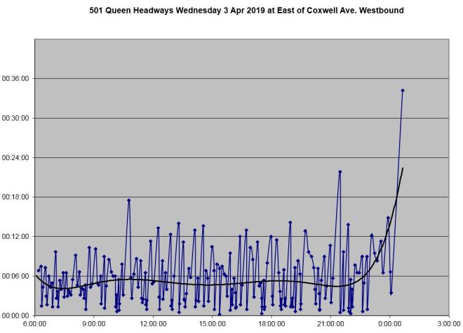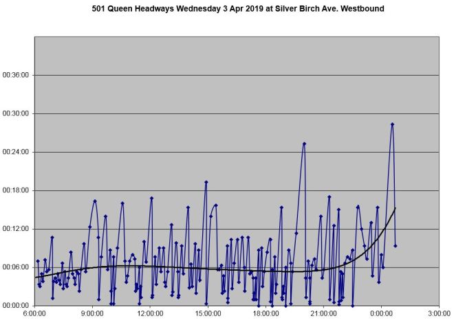 A typical problem on Queen is that at the end of the morning peak period, headways at terminals can be larger than usual because route supervisors are cleaning up after the peak. This shows up for the 9:00 and 10:00 data below. The rise late at night is the scheduled transition to “baby night” service.