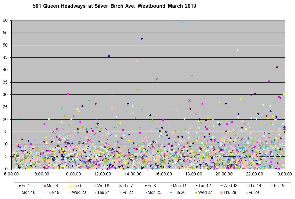 The charts below show all of the trips for every weekday in a month on one page for headways westbound at Silver Birch in March and April 2019. Each dot on the chart is one trip leaving Neville. The shape and colour give the date, the horizontal position the time of day, and the vertical position the headway. The vertical scale reaches up to 60 minutes to fit in all of the data points for some very wide gaps. The intent of this format is not for detailed analysis, but to show the overall character of the numbers.