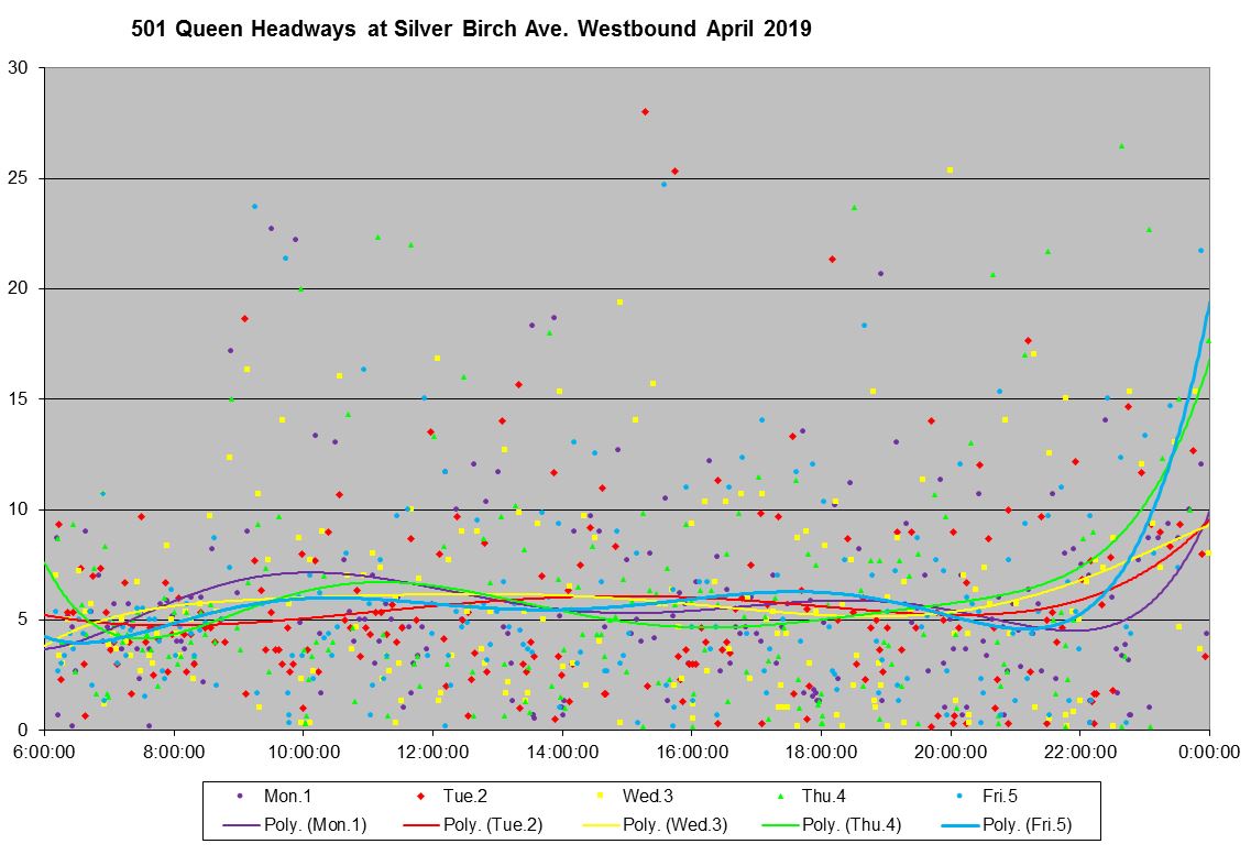 A typical problem on Queen is that at the end of the morning peak period, headways at terminals can be larger than usual because route supervisors are cleaning up after the peak. This shows up for the 9:00 and 10:00 data below. The rise late at night is the scheduled transition to “baby night” service.