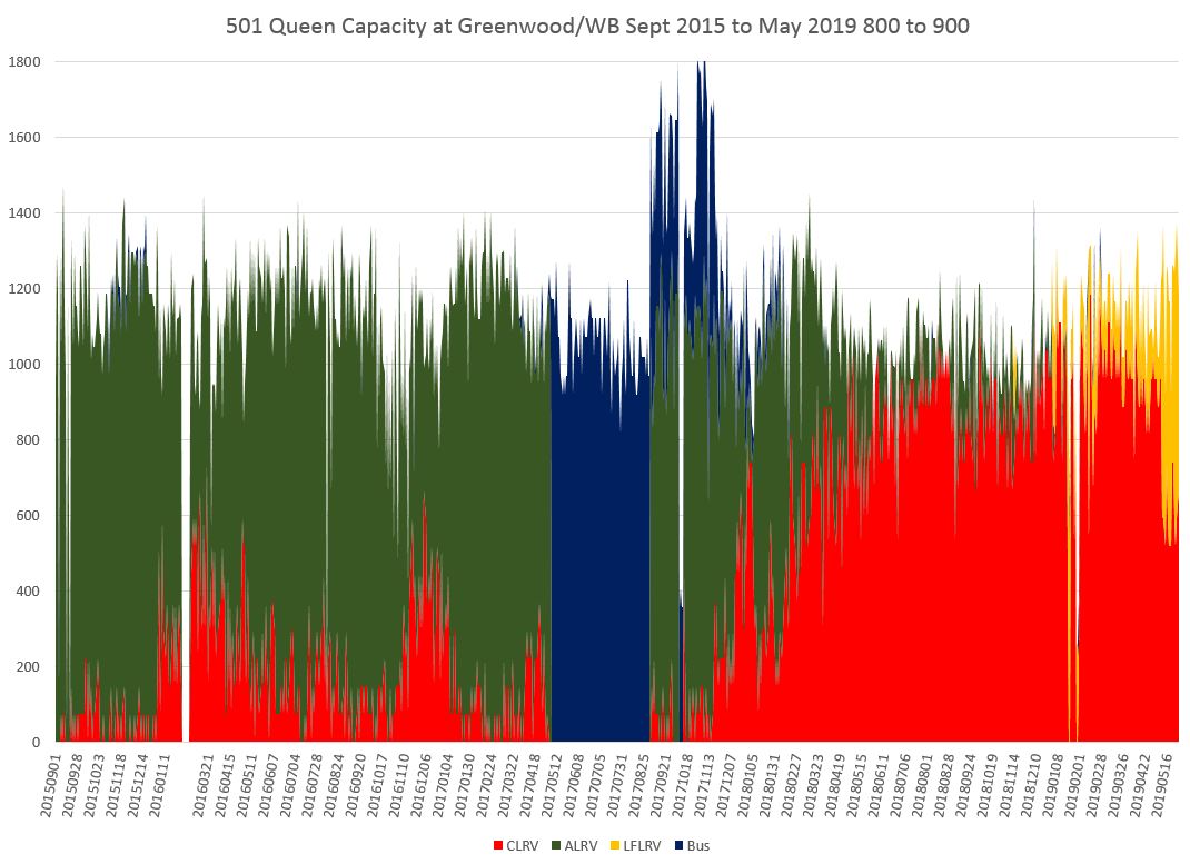 The capacity at Greenwood westbound shown here is lower than at Lansdowne because the west end numbers include Long Branch trippers running through to downtown, but the east end numbers do not include service on 502/503 Kingston Road services. The high numbers in summer 2017 correspond to a period when bus shuttles to Neville overlapped the eastern end of streetcar service.