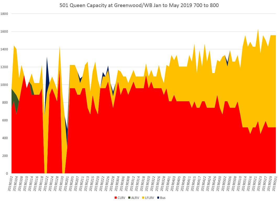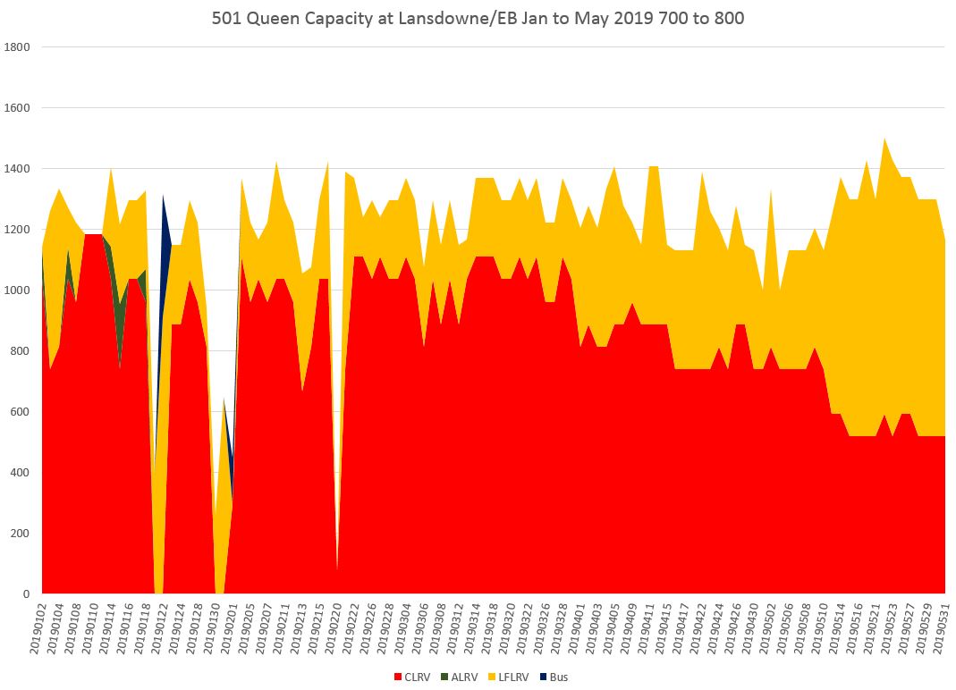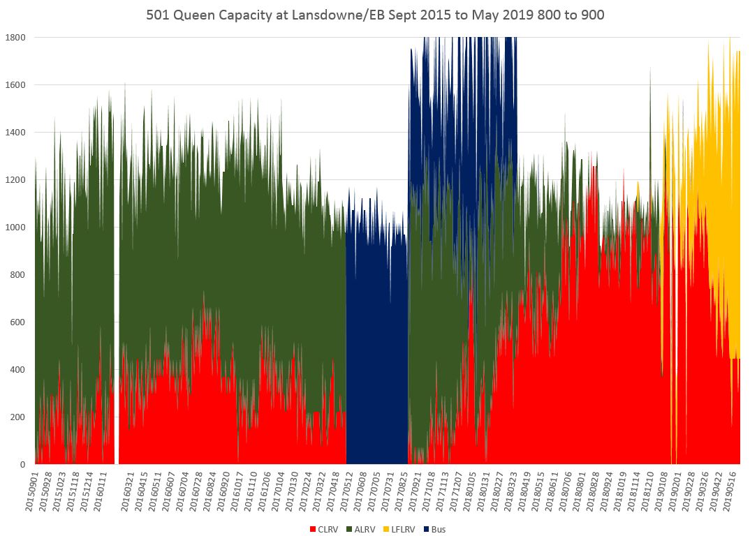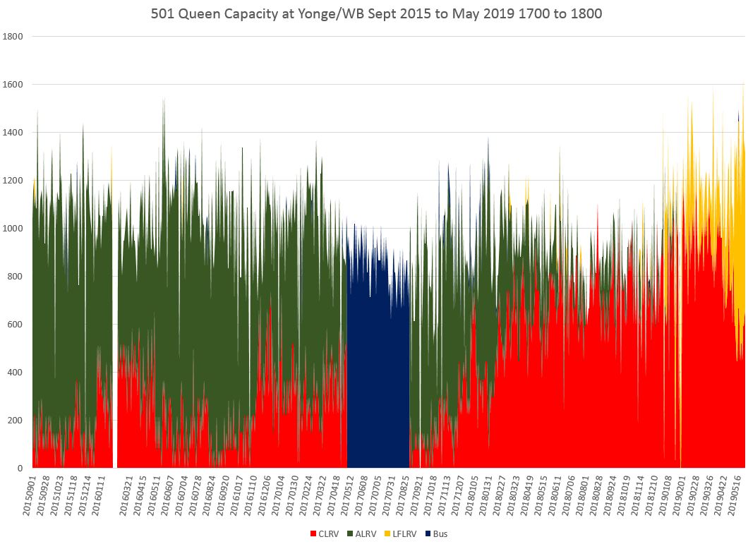 With the effect of the larger Flexitys, capacity in May 2019 was above the level seen in 2016. The very high numbers from fall 2017 to spring 2018 are due to the overlap of streetcar and Long Branch bus service at Lansdowne. The buses are in blue and the through streetcar service capacity is made up of mainly of ALRVs (green) and some CLRVs (red).