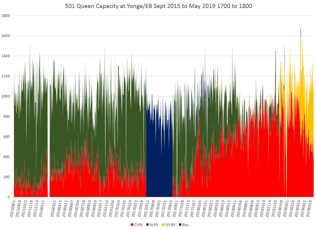 At Yonge, the capacity both ways in May 2019 was on a par with historical levels in 2015-16 thanks to the larger sized Flexitys.
