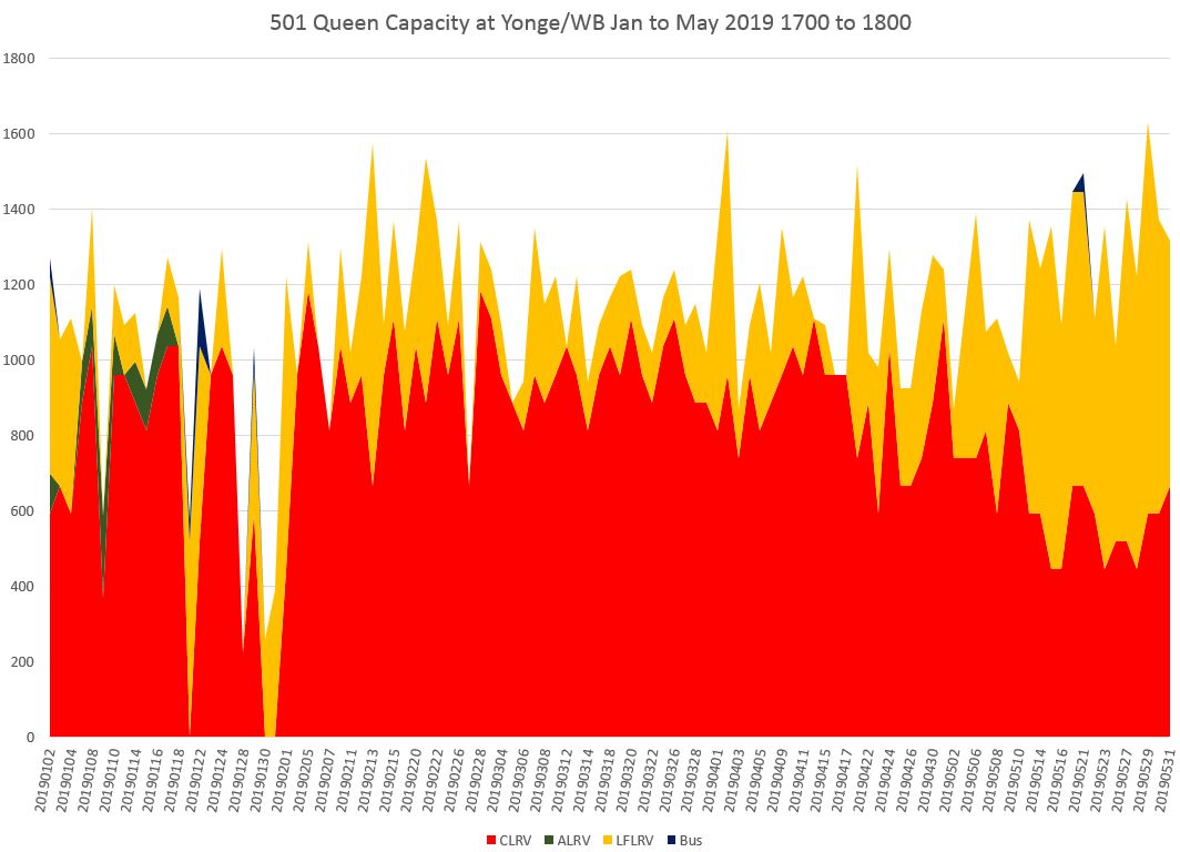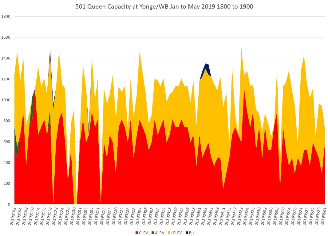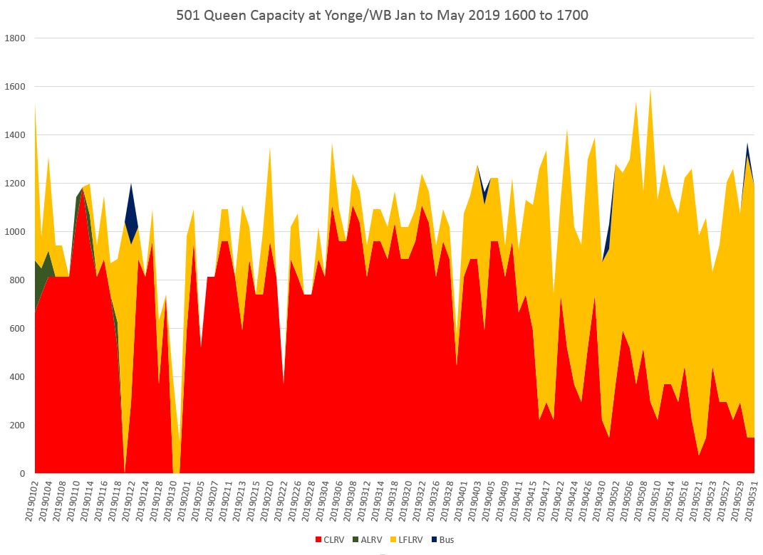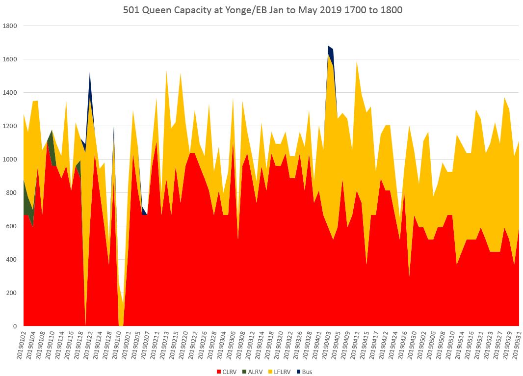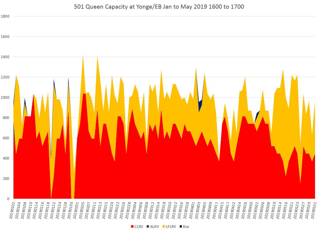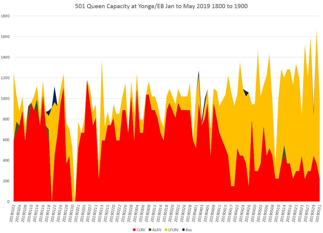 In the afternoon peak, capacity at Yonge has been building up as the Flexitys displace the CLRVs, but there is a quite steep decline in the hour from 6:00 to 7:00 pm caused by service irregularity.