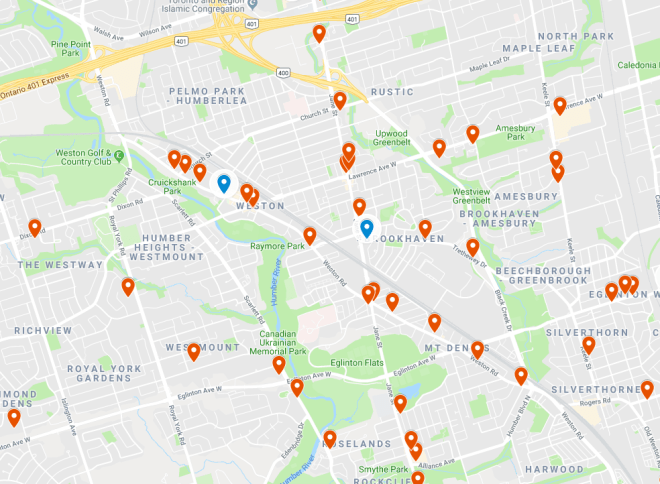 Steve: This was discussed at the Board meeting. There are only a few libraries and community centres in the Mount Dennis area (the location of Mike Sullivan’s map), and moreover their hours are not as extensive as at most convenience stores. If you pull up maps of Loblaws, No Frills and Valu Mart stores in Toronto, you will see that they are thin on the ground, especially near Mount Dennis and Weston.