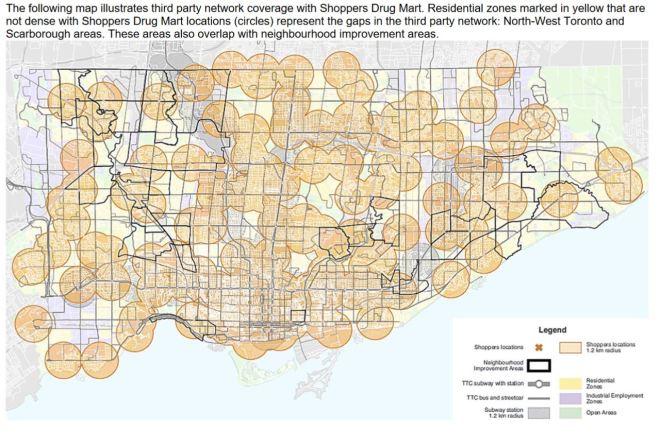 The effect on a fine-grained level was shown in a deputation at the meeting by Mike Sullivan, a former MP for York South Weston, speaking on behalf of TTC Riders. The map below is his. It shows the two Shoppers outlets in Weston and Mount Dennis (blue) and the many more numerous TTC fare media outlets (orange). Large areas of this map are beyond a ten minute walk from either of the Shoppers locations or of Weston GO Station. There are no Loblaws stores in this area.