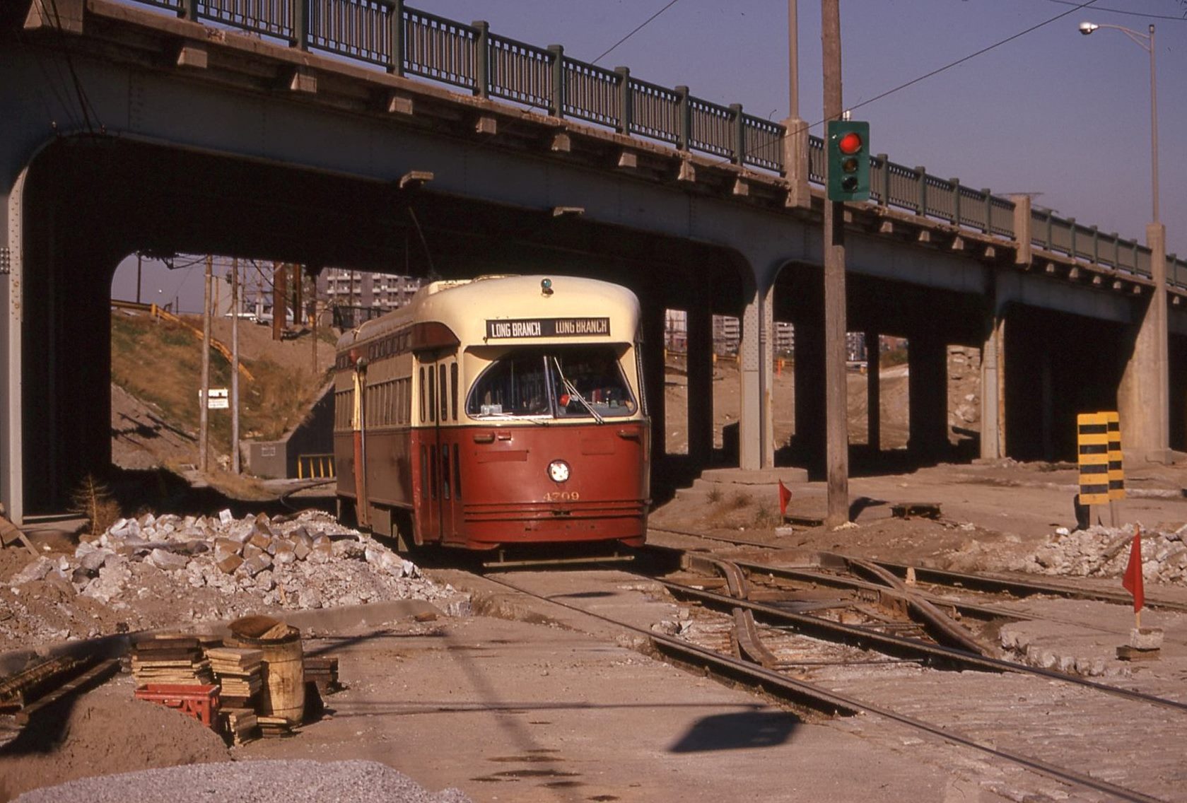 Published June 29, 2019 at 1679 × 1136 in Humber Loop QEW Realignment 1973-74 ← Previous Next → Single track crossover at Lake Shore exit from Humber Loop. Oct. 21, 1973