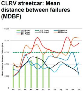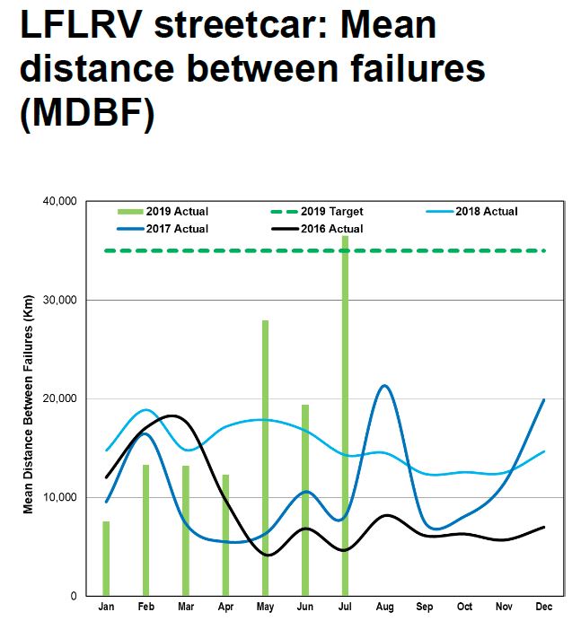 The September 2019 CEO’s Report contains Mean Distance Between Failure (MDBF) charts for both types of streetcars still in active service. August 2019 saw the new fleet’s reliability go about the 35,000 km MDBF, and CEO Rick Leary reported at the TTC Board meeting of September 24 that the current number was running above 50,000 km.