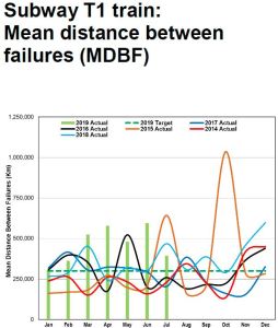 2. What is the situation with subway delays and MDBF numbers? Are all failures counted (at least those producing a 5 minute or greater delay) or only those considered to be the manufacturer’s fault? Is the calculation done the same way for the TR and T1 fleets?