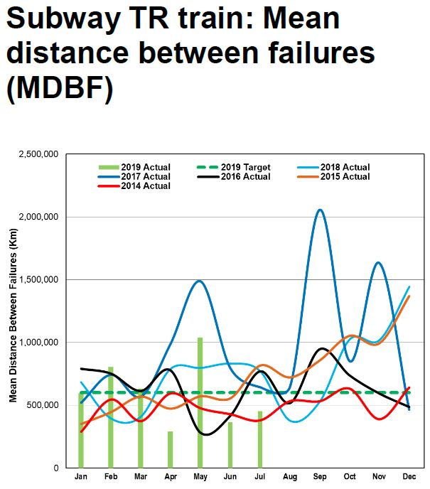 They showed the cars had an MDBF of 36,500 km in July, and 51,500 km in August, the best the fleet has recorded since the early days of the order. CEO Leary cited that most recent figure at last Tuesday’s meeting as evidence the cars are “performing exceptionally well.”
