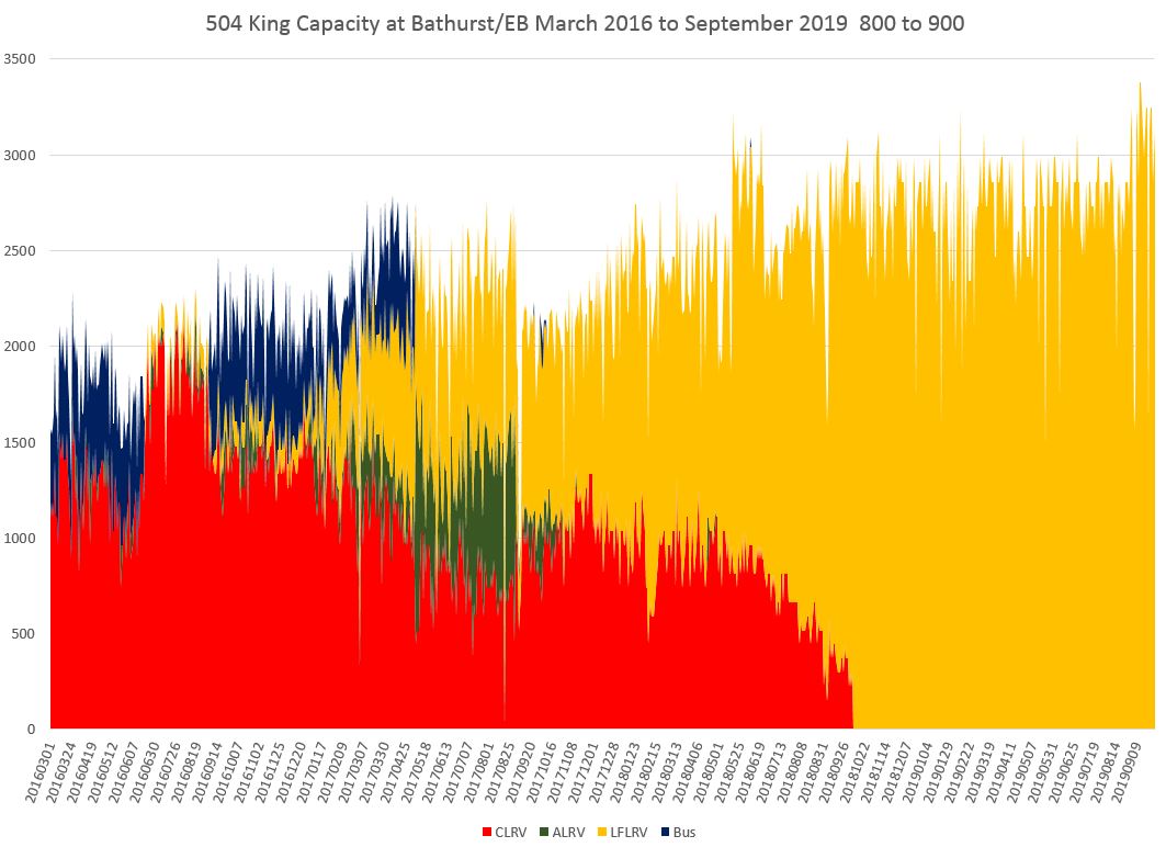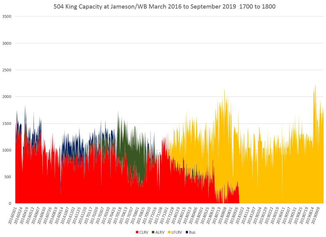 In this, the final part of the series reviewing operations on the King Street corridor, I present updated charts showing the capacity of service offered at various locations along the 504 King route since March 2016, and a history of schedule changes there since September 2017. The capacities shown are based on actual day-to-day operations and can vary a great deal from the scheduled offerings.