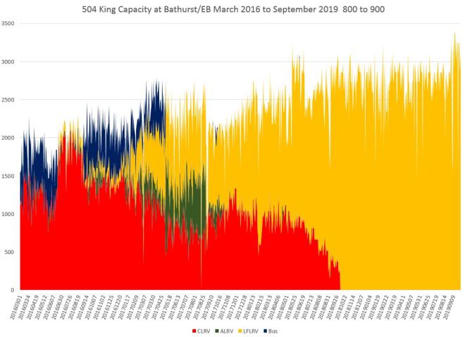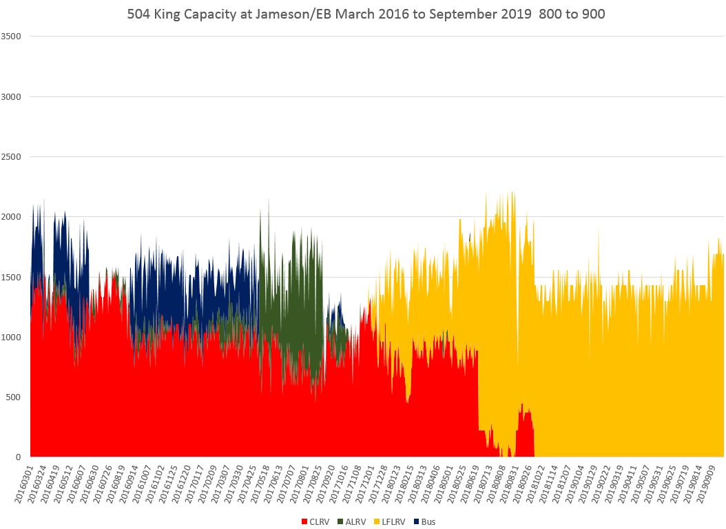 Capacity at Jameson westbound shows two effects. In the latter half of August, the 504B Dufferin Gate service was rerouted to Roncesvalles, and so more cars crossed Jameson. In September, the 508 Lake Shore service added three cars during this hour above the basic 504A Dundas West service.