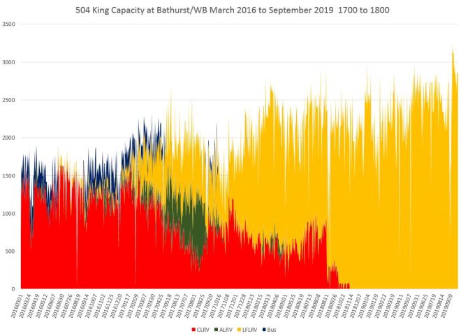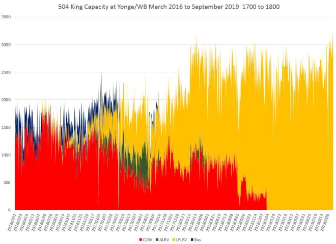 By the afternoon rush hour, service on most transit routes is less well-organized than in the morning because of the accumulated effect of traffic conditions through the day. Westbound capacity at Yonge Street during the peak 5-6 PM hour varies considerably from day to day although the 508 Lake Shore trippers have contributed since September 3, 2019. Three of these cars are scheduled to pass Yonge westbound during the hour.