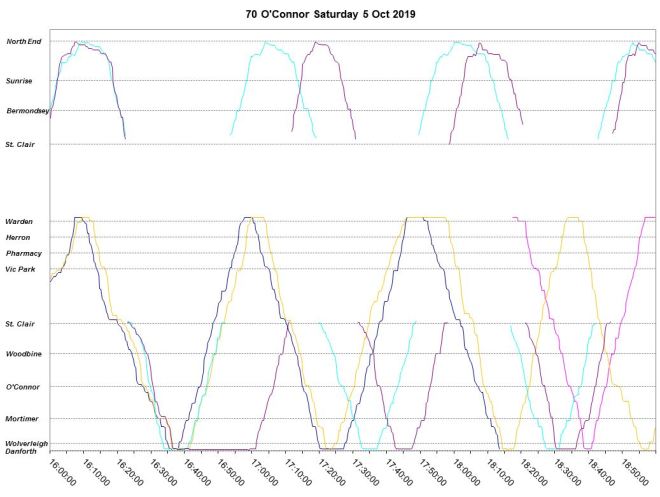 Saturday is better, particularly in the morning and evening, but afternoons are very bad on the 5th and 12th of October. Remember that this is the branch of 70 O’Connor that is not affected by construction of the Crosstown at Eglinton and Victoria Park.