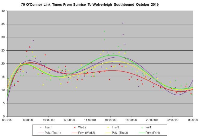 These charts show the round trip time from O’Connor and Sunrise north to Eglinton, around the loop via Creighton and back to Sunrise and O’Connor. Where there are much shorter times (primarily in the evening) these are buses that took the much shorter turnback without going north of Eglinton (the 70B Eglinton Square routing). Some of these are daytime short turns.