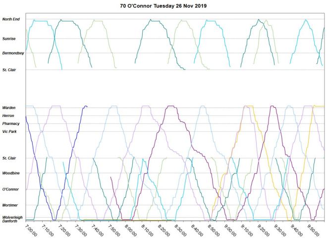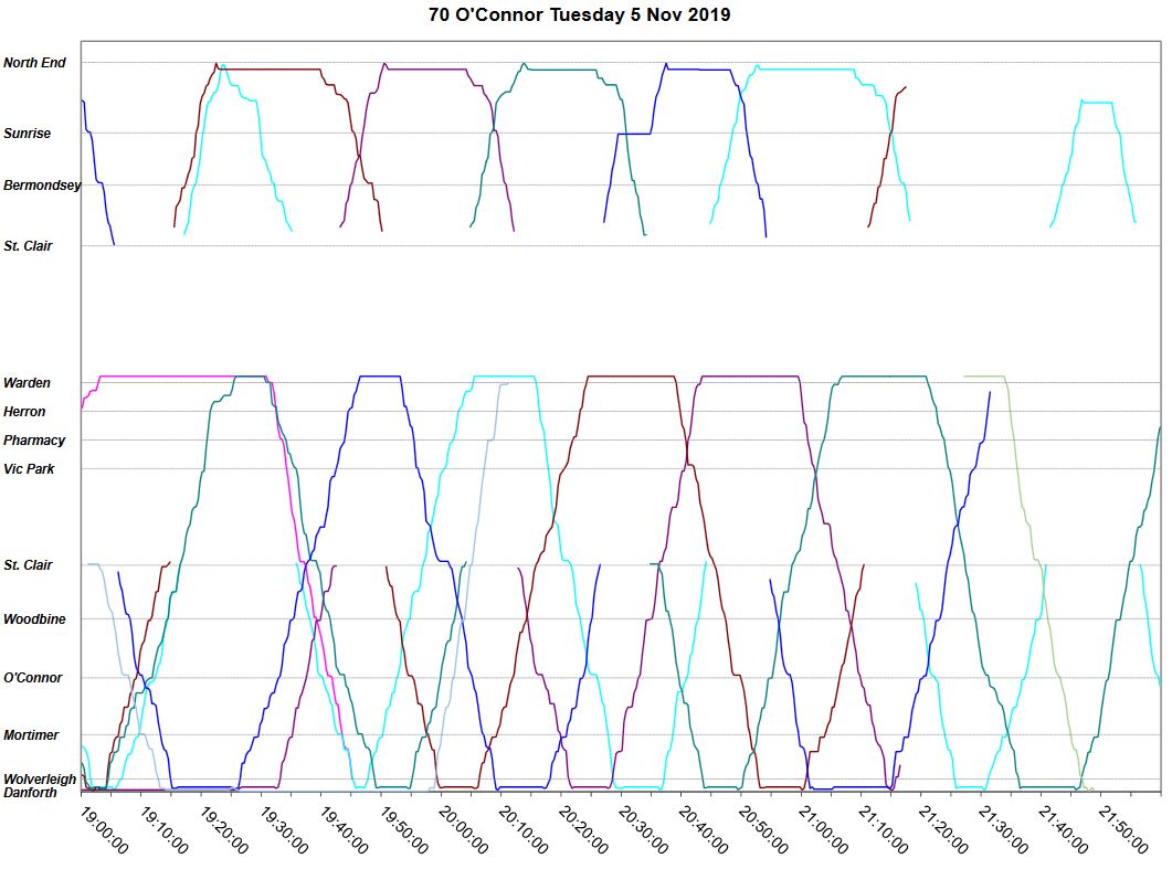 The November 2019 tracking data came in a while ago, but I have been distracted by other issues, notably the TTC budgets, and a lot of holiday cheer. Riders of the O’Connor bus need a lot of cheer to get through what passes for service on that route.