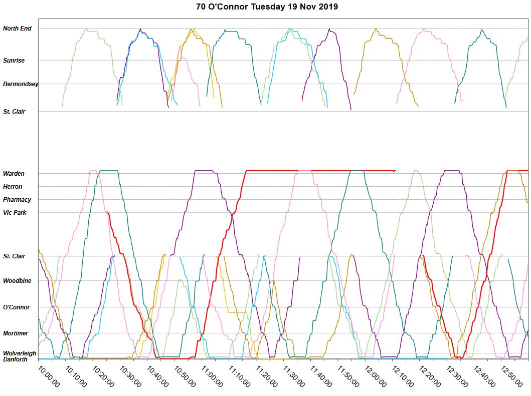 Saturdays in November showed the same pattern as in October with reasonably maintained service in the morning and evening, but a complete hash in the afternoon with all four buses coming together for some sort of tryst at Coxwell Station. The problem is already developing at 1 pm and it gets worse as the afternoon goes on with all four buses making a joint round trip starting at about 3 pm. Note that the only sign of “congestion” is westbound on O’Connor near St. Clair, and it is not severe.