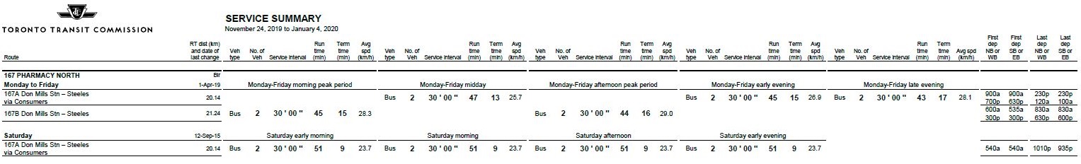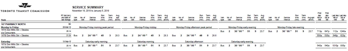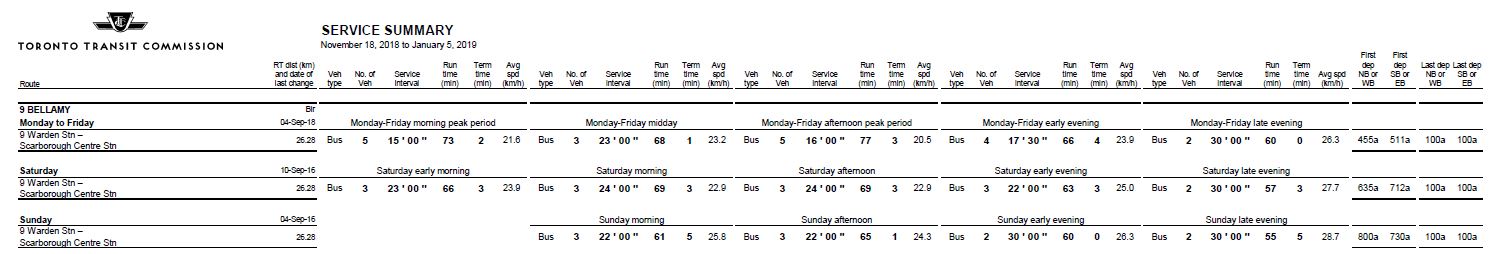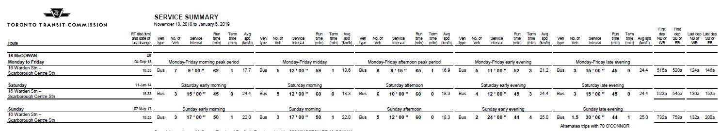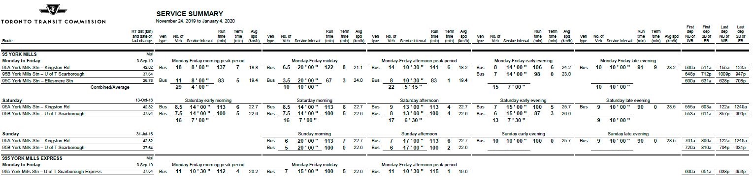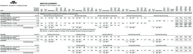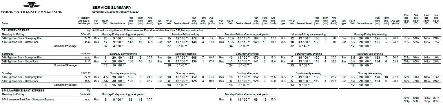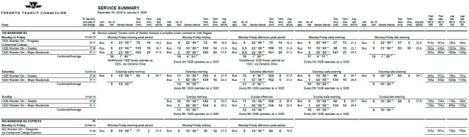 Under each route description below, I have included snapshots from the Scheduled Service Summaries for November-December 2018 and for November-December 2019. Express and local services are grouped together, and in the case of the Eglinton East corridor services (86, 116, 905 and 986) these are all collected so that various aspects of service in the corridor can be seen together.