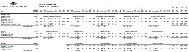 At the end of 2018, the services on Royal York were interlined because of construction at Royal York Station. After they were split, service during all periods on all days on 73 Royal York was less frequent than before due in part to concurrent resiliency changes.