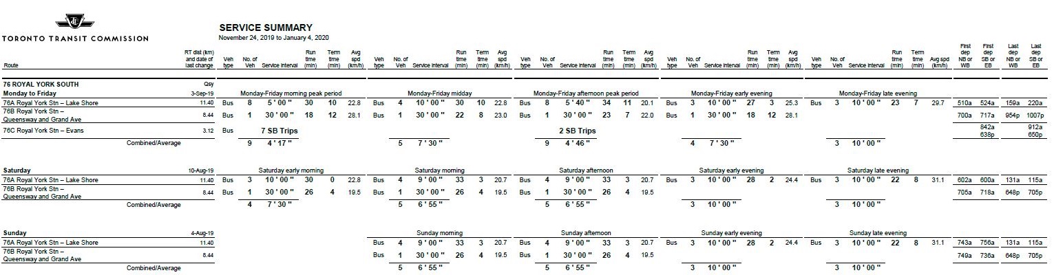 Peak period service improved on 76 Royal York South after the split, and there was a slight improvement in midday weekday service with normalization of headways to clockface values. Weekend daytime service also improved.