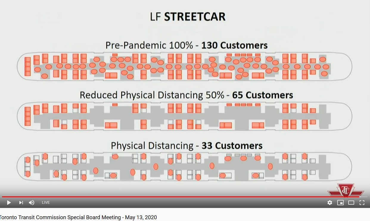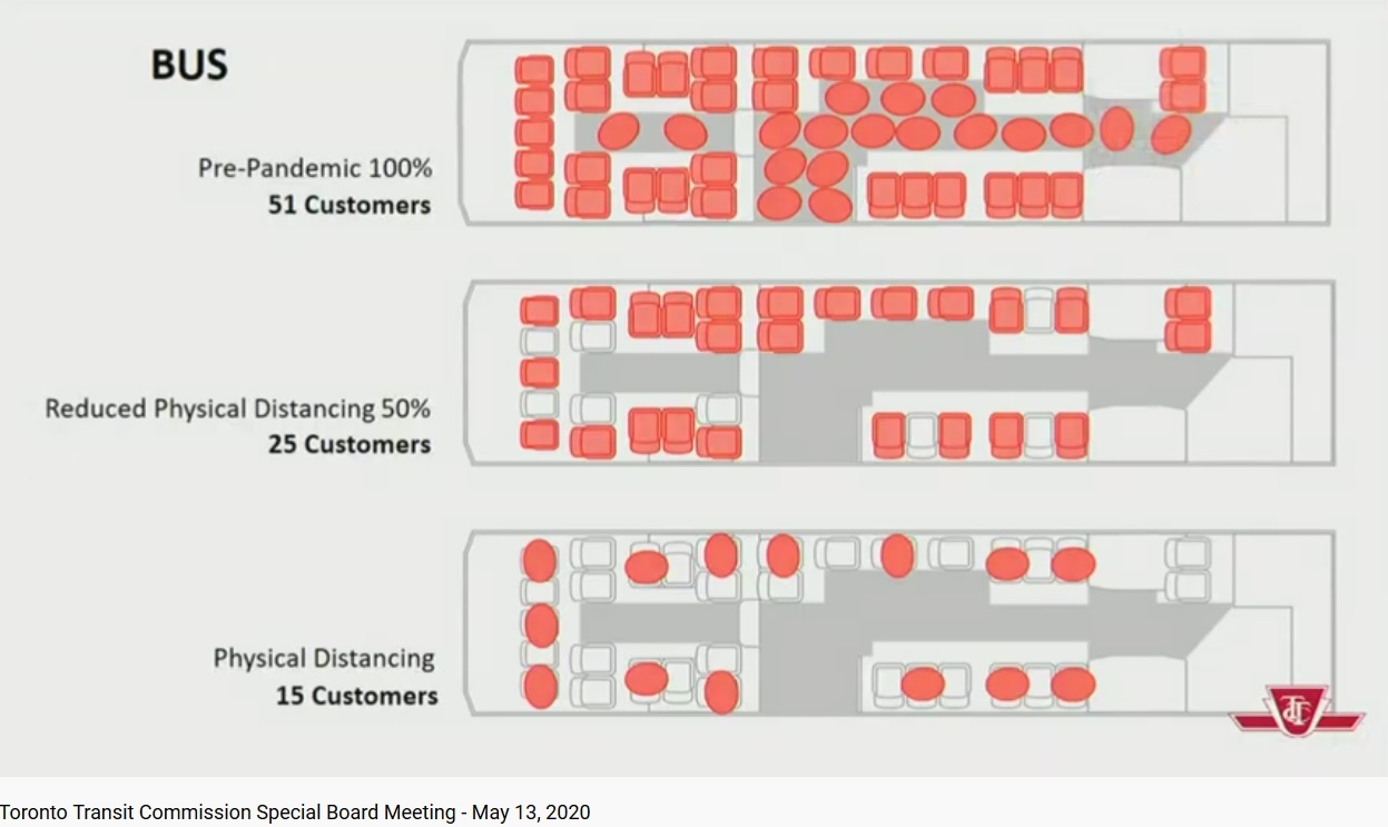 The ratio of normal to current (two metre) capacities shown are 3.4 for buses, 3.9 for streetcars and 4.5 for subways. One might reasonably quibble that the spacing shown for some cases, notably at the rear of buses, does not meet the rule, but in any event, this shows the extent of lost capacity. The replacement factor for all modes lies somewhere between three and four vehicles in the fully distanced, two metre environment.