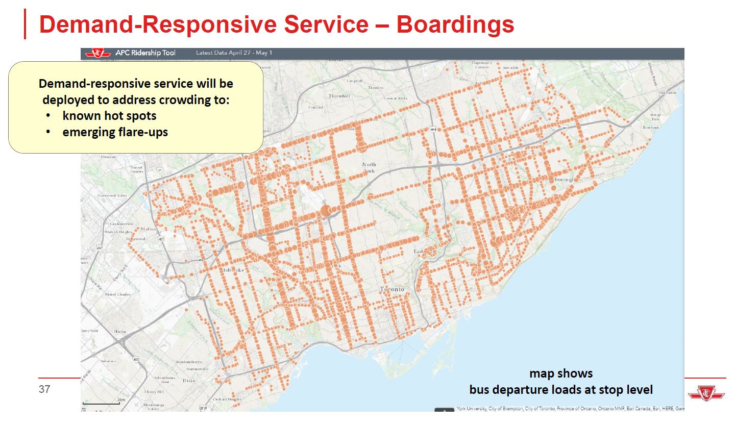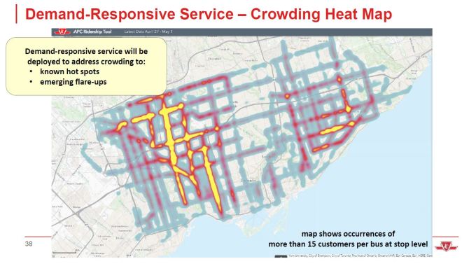 The map of current hot spots shows how important the suburban bus routes are. We may have lots of room on the subway, but that won’t get people to work on the bus lines. If a return to 50 per cent demand is unevenly distributed, the pressure for even more service in parts of the network will be severe, and it is not clear how much extra service the TTC can field due to both fleet and staff constraints.