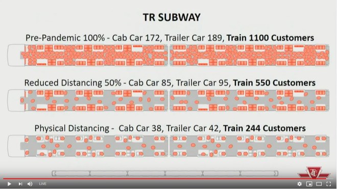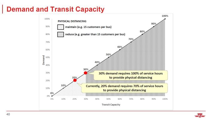 With distancing in effect, the practical capacity of vehicles is much lower than the usual level. In the charts below, three capacity levels are shown: normal service standards, 50 per cent load, and the load with a two metre rule in place.