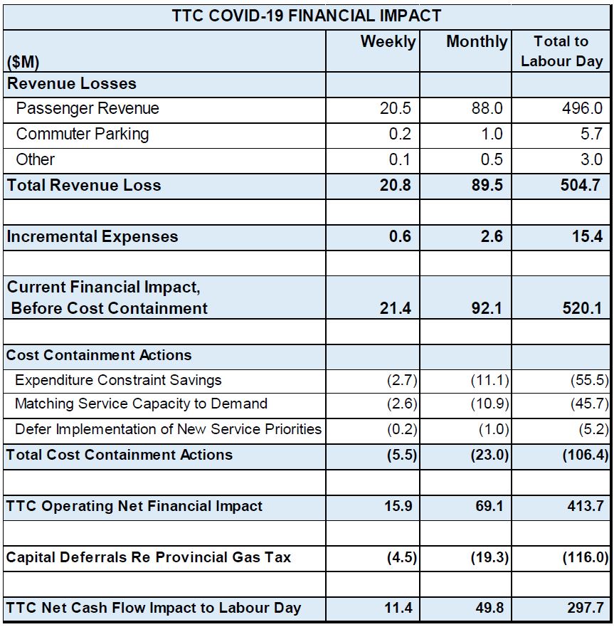 A widely reported number is the half-billion dollar shortfall in TTC revenues in the period up to Labour Day. Even with an offset of about $200 million in savings for a net deficit of $300 million, this is still not small change.