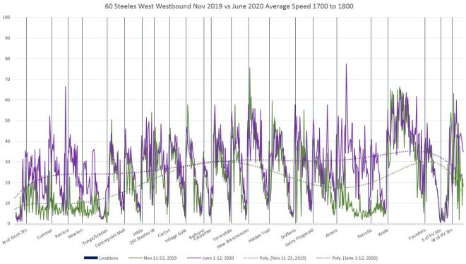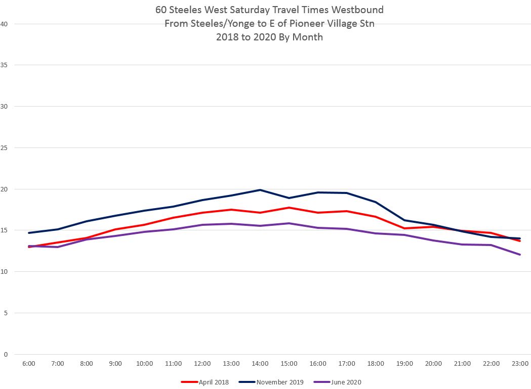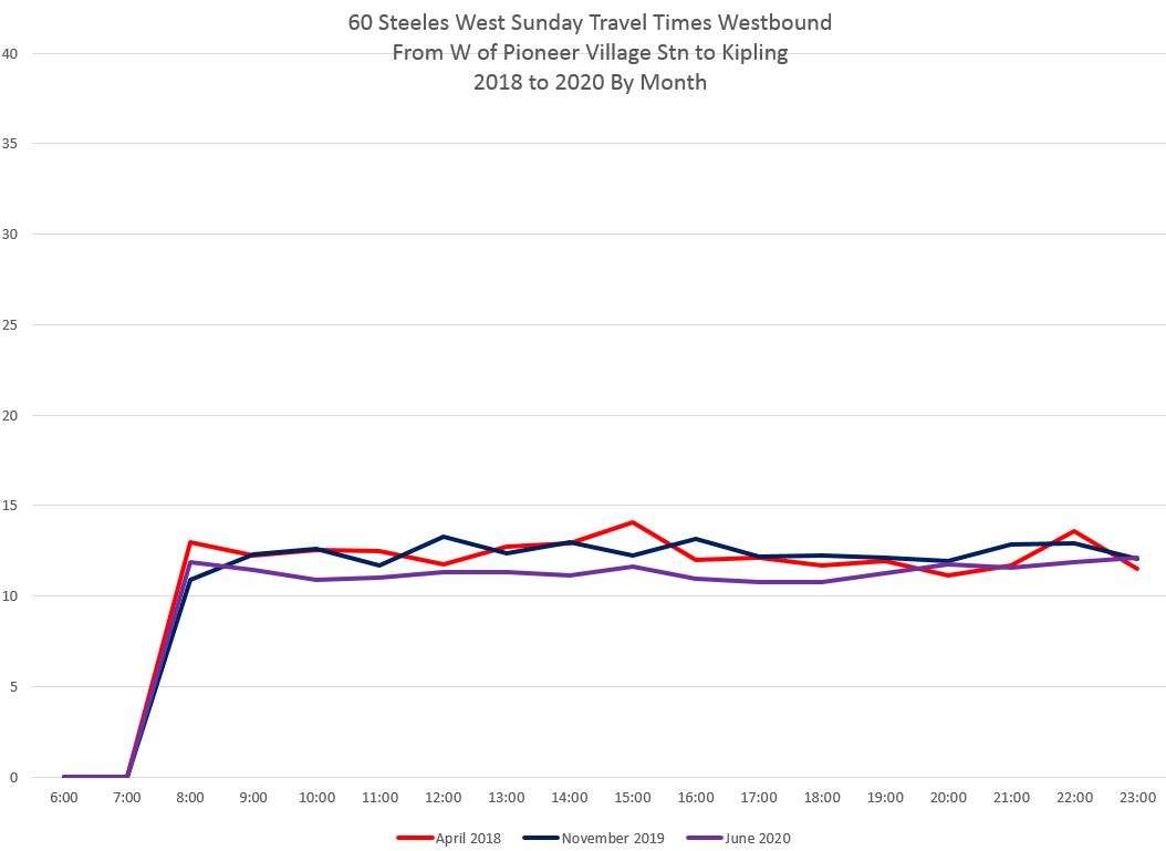 - 60 Steeles West is a route that I have not been following closely, and therefore I do not have as many data sets with tracking data for this route as for some others in the series. Data are presented here from April 2018, November 2019 and June 2020.